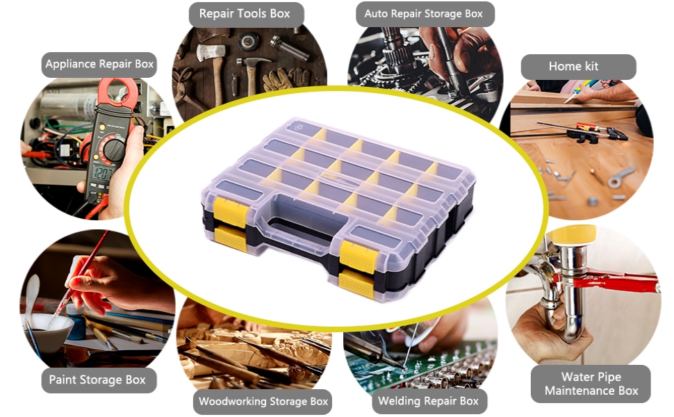 منظم أدوات مكون من 34 حجرة: تصميم مزدوج الجانب، فواصل قابلة للإزالة يمكن تركيبها وخلعها بسهولة لتخصيص مساحة منظم البراغي، لتخزين الأدوات والمسامير والمسامير والأجزاء الصغيرة وأدوات الصيد والعديد من العناصر الأخرى