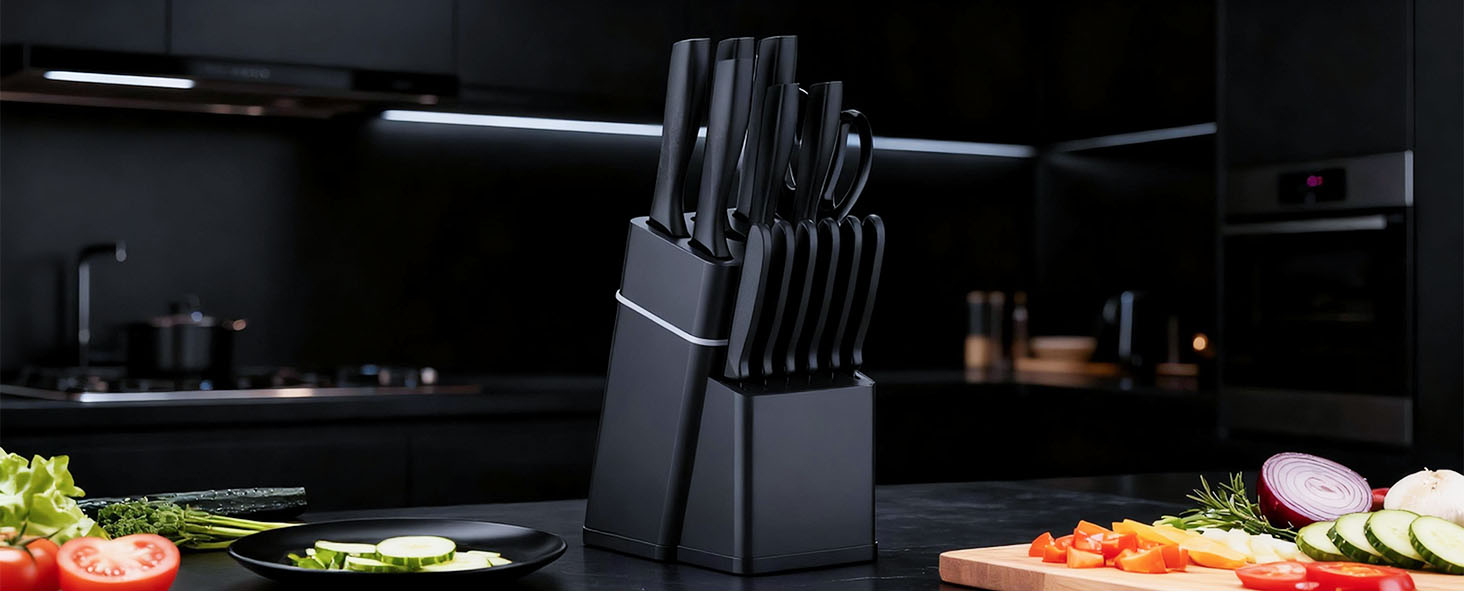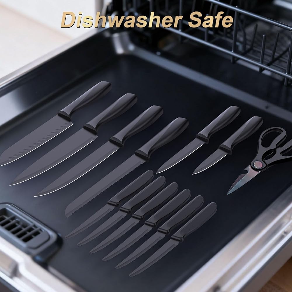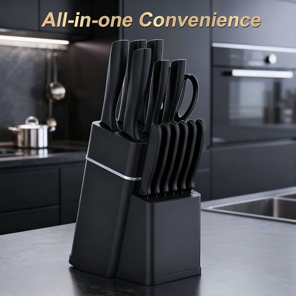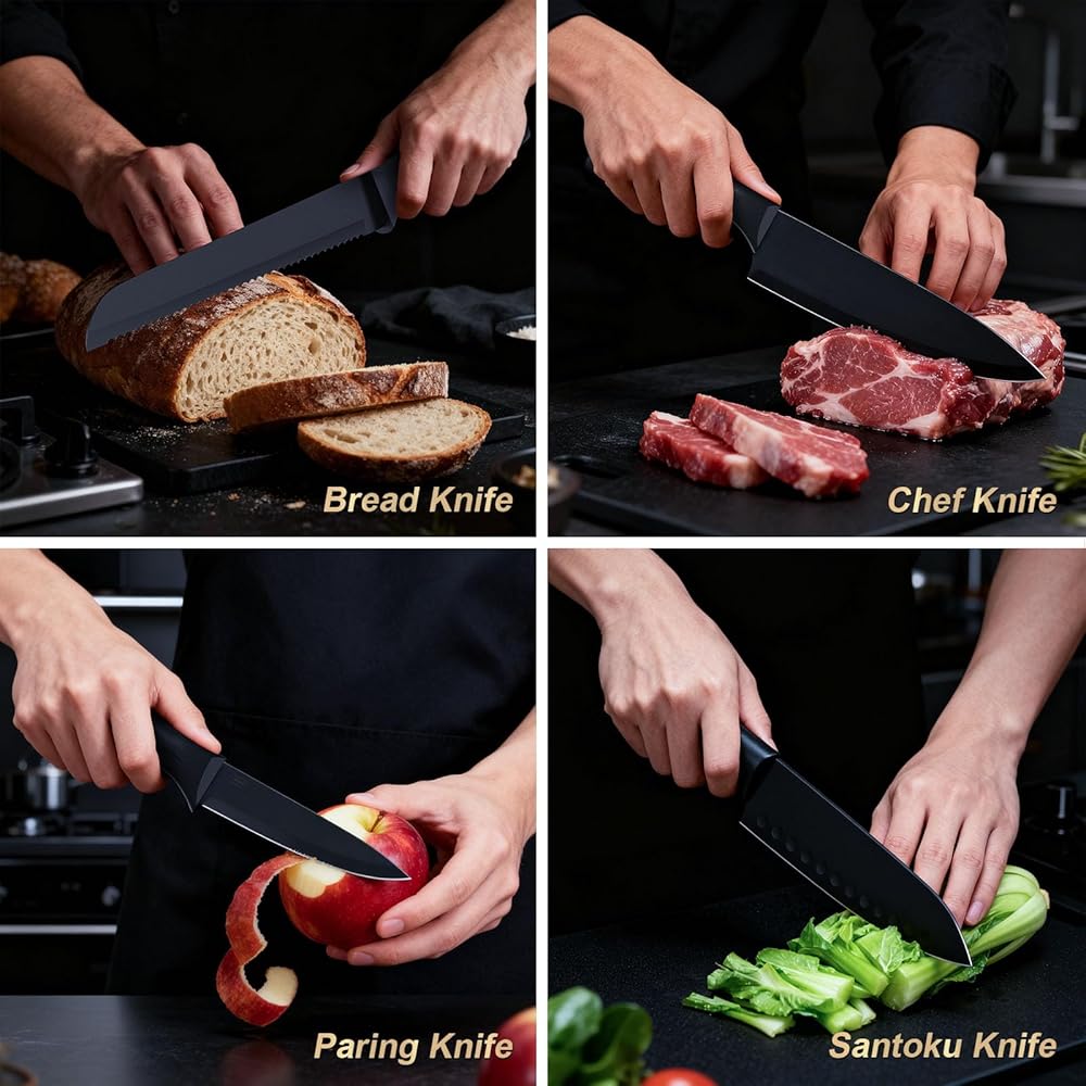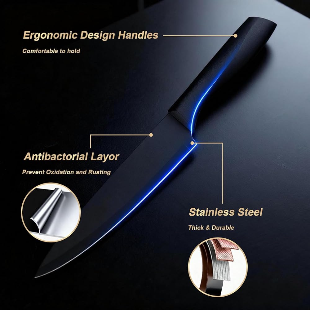 🔪مجموعة أساسية كاملة للمطبخ: تتضمن جميع السكاكين التي يجب اقتناؤها: سكين الطهاة، وسكين الخبز، وسكين الأدوات، وسكين التقشير، ومقصات المطبخ. سواء كنت تقوم بتحضير اللحوم أو الخضروات أو الفواكه أو السلع المخبوزة، فإن هذه المجموعة متعددة الاستخدامات تغطي كل مهمة قطع دون عناء.