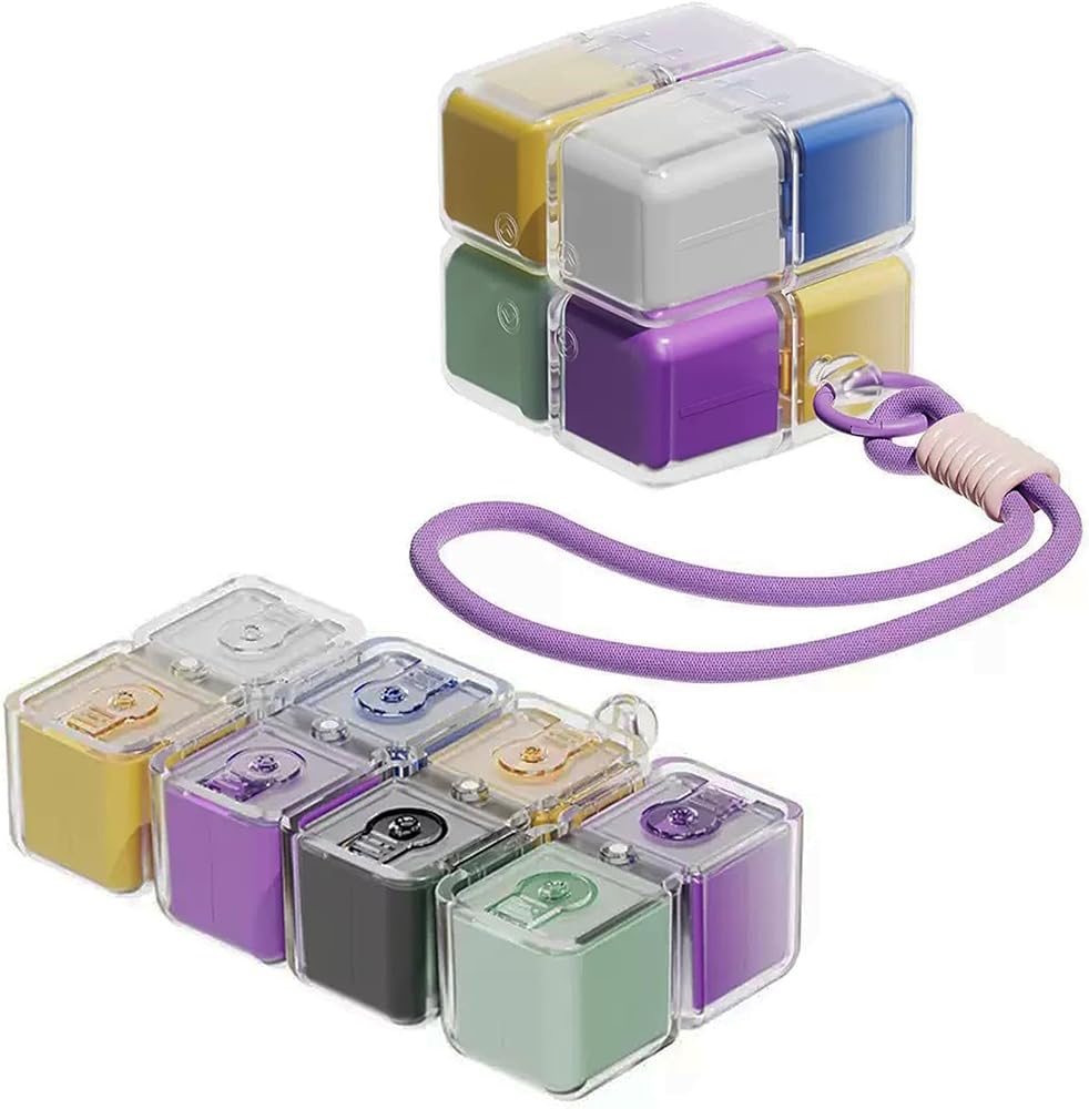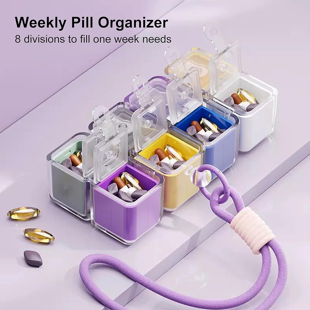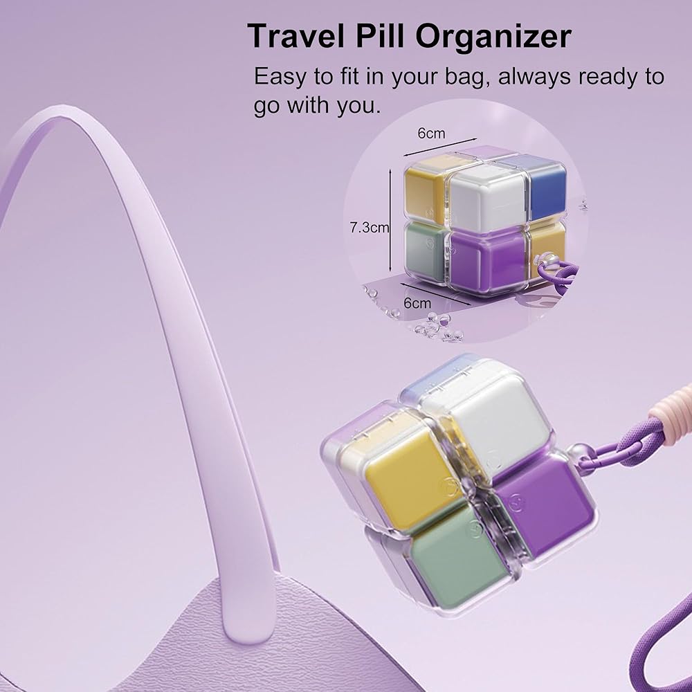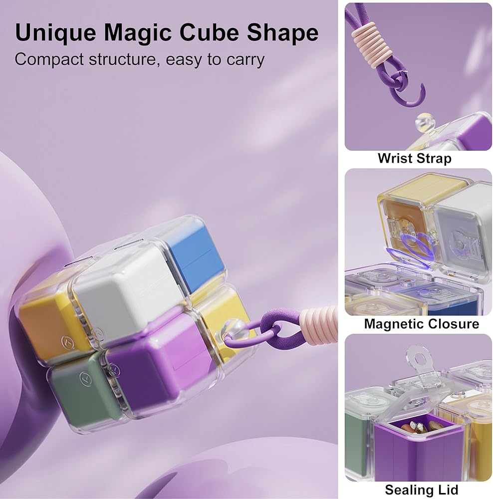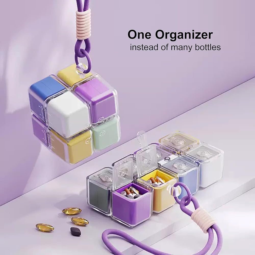 This innovative travel pill organizer combines convenience and functionality in one compact design. Featuring 8 individual compartments, this weekly medicine case allows you to organize your daily medications, vitamins, or supplements for an entire week. Each colorful compartment is clearly distinguishable, making it easy to keep track of your daily doses and ensuring you never miss a medication. The clever modular design connects all compartments together in a cube-like formation, replacing the need for multiple bottles cluttering your bag or purse. The durable construction includes clear lids on each compartment so you can quickly see what's inside without opening them. A convenient carrying strap is attached, making it perfect for travel, work, or keeping in your gym bag. The portable size fits easily into luggage, purses, or backpacks, while the secure closures prevent accidental spills. Whether you're managing multiple medications, daily vitamins, or just need an organized way to transport your supplements, this weekly pill organizer streamlines your routine and keeps everything you need in one accessible place.