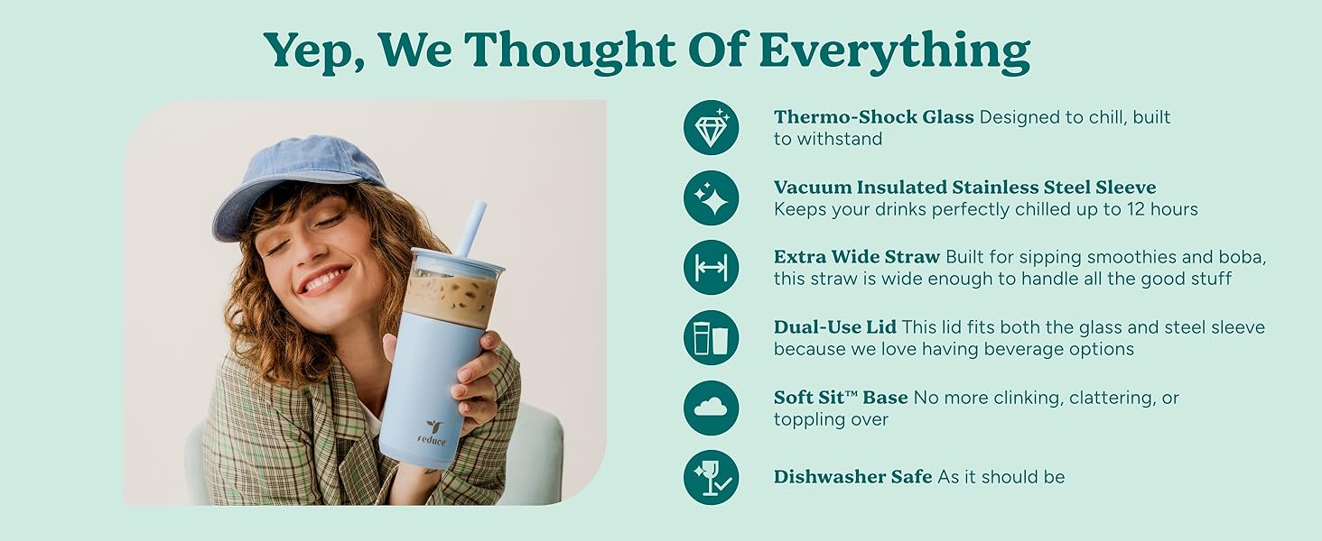 • يحافظ على المشروبات باردة لمدة 12 ساعة: استمتع بالمشروبات الباردة المنعشة طوال يومك، بفضل الكوب الزجاجي المعزول بالفراغ الذي يحافظ على المشروبات باردة لمدة تصل إلى 12 ساعة؛ مثالية للحفاظ على قهوتك المثلجة منتعشة وعصائرك المنعشة مبهجة.