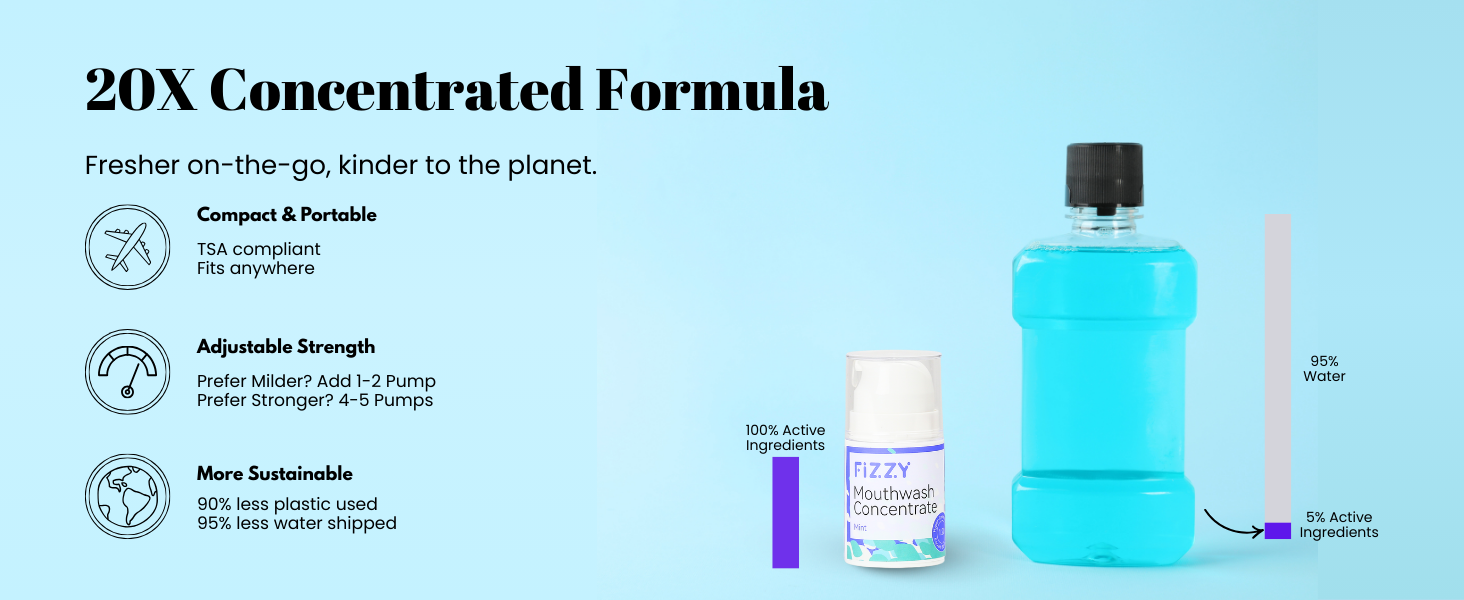 مركزة 20 مرة ومناسبة للسفر: كل زجاجة بحجم الجيب تساوي 32 أونصة من غسول الفم مع أكثر من 70 استخدامًا. متوافق مع TSA وسهل الاستخدام أثناء التنقل.