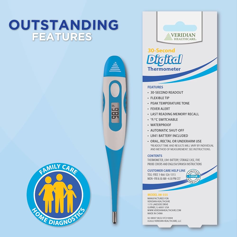 OUTSTANDING FEATURES AND BENEFITS—Whole family-friendly, the Veridian 30-Second Digital Thermometer includes 9-second measurement, a soft, flexible tip with an alert when the reading is complete, an alarm when a fever is present, and hygienic storage case.