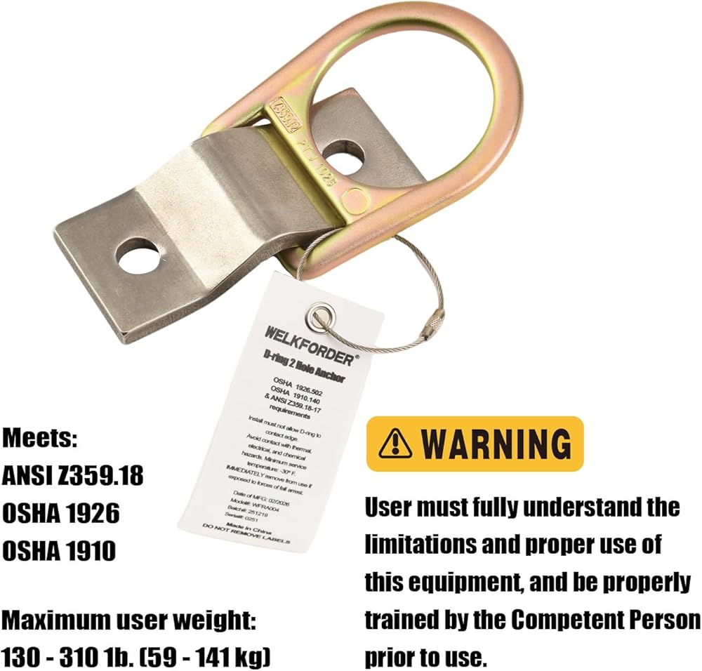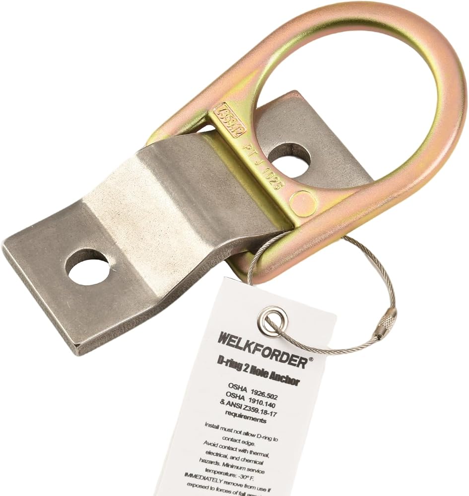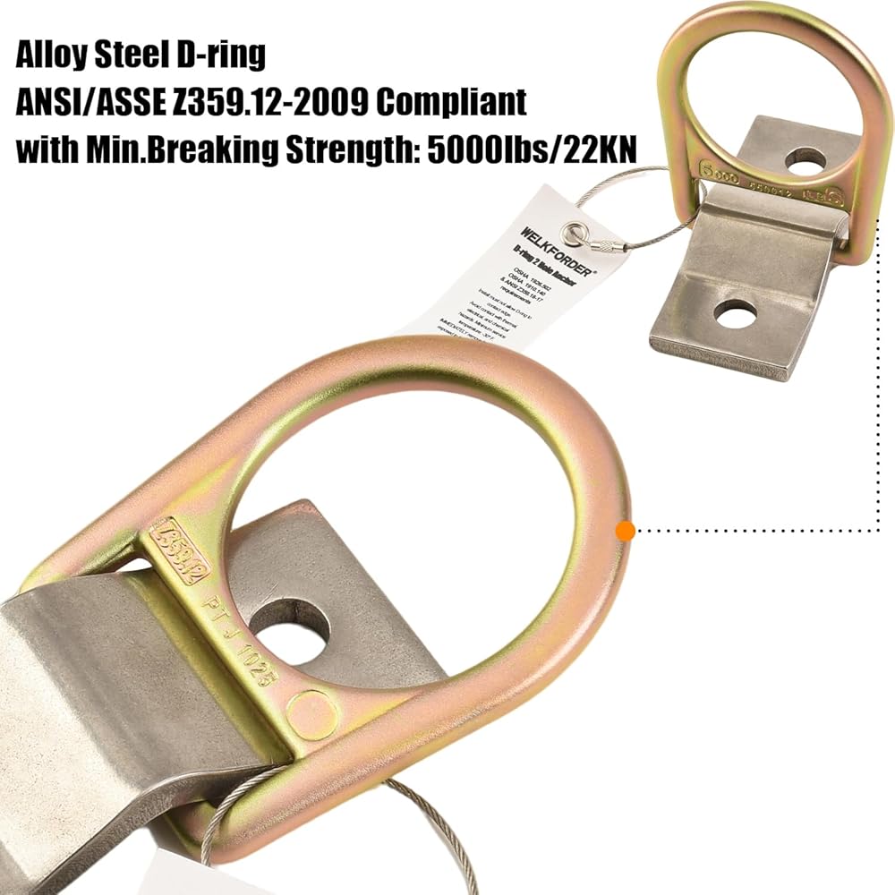• HIGH STRENGTH D-RING & BAR: WELKFORDER D-Ring 2 Hole Anchor is made of Alloy Steel D-Ring with Stainless Steel Bar with Minimal Tensile Breaking Strength of 5000 LBS, reducing the risk of fall and fatigue. Provides workers flexibility and ease of movement, making it safe and reliable. USER CAPACITY: 1 Person with a combined weight (clothing, tools, etc.) of no more than 310 lbs.