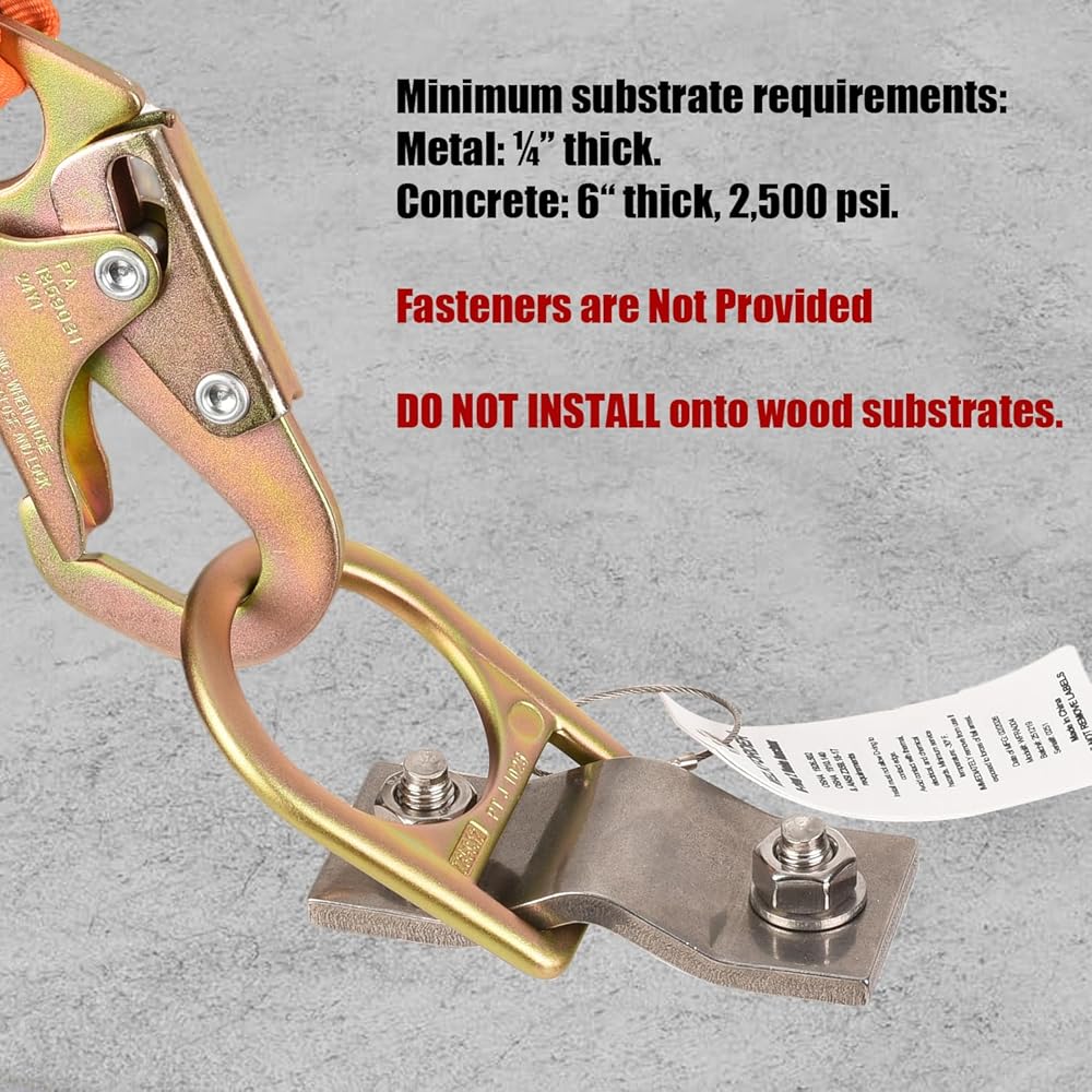 • EASY INSTALLATION: WELKFORDER D-Ring 2 Hole Anchor is installed on Metal and Concrete Substrate. DO NOT INSTALL onto wood substrates. Use two ½“ diameter, grade 8, metal deck bolts for Metal Substrate. Use two ½” diameter, 3“ long, grade 8 concrete bolts for Concrete Substrate with Minimum 3,600 lb. pullout strength required. (Fasteners are Not Provided)