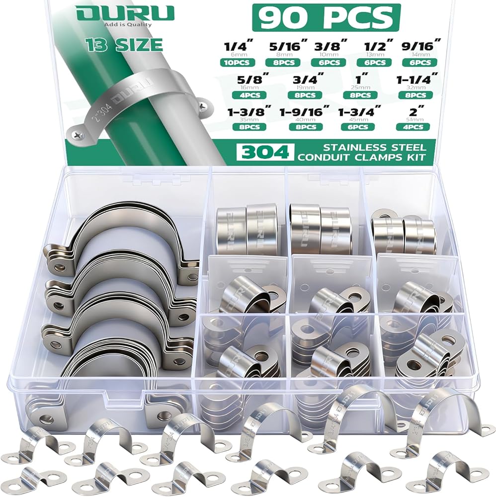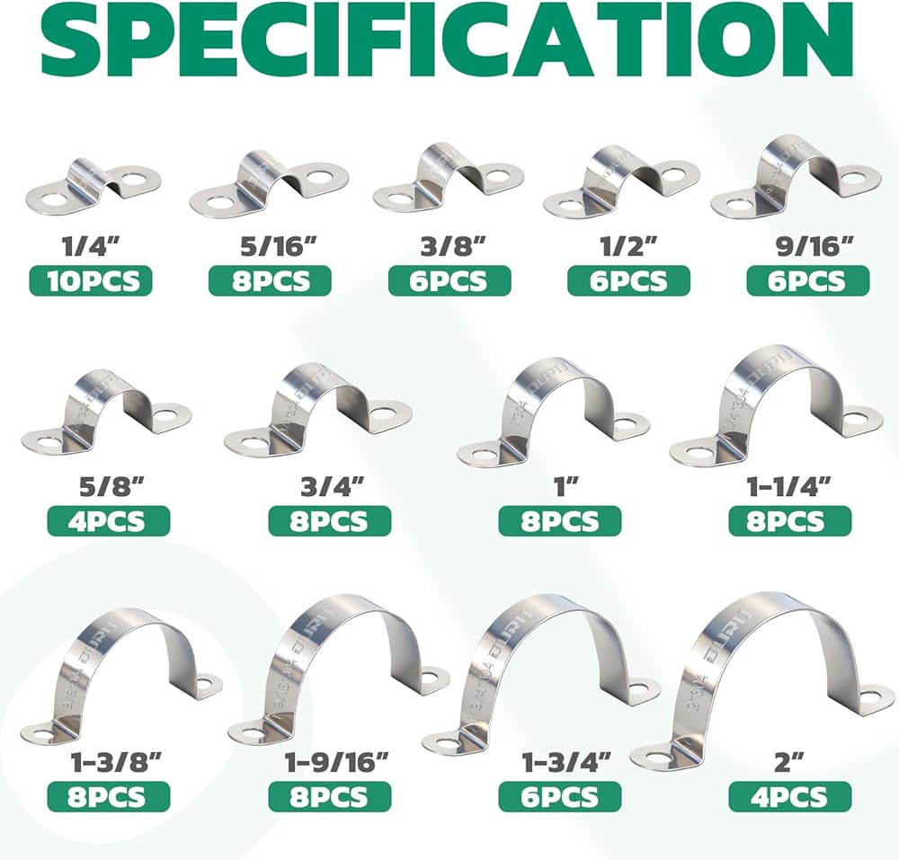 مواصفات المنتج: تتضمن هذه المجموعة 90 قطعة من المشابك على شكل حرف U في 13 مقاسًا، مناسبة لتطبيقات الأنابيب المختلفة. تتميز بحقيبة تخزين مقسمة لسهولة الحمل والتنظيم.