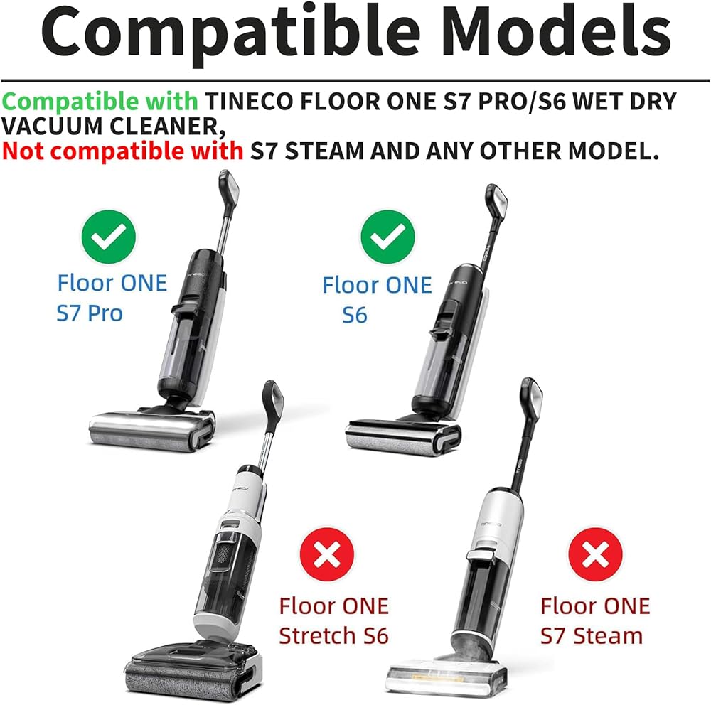 توافق سلس: متوافق مع مكنسة الأرضيات الرطبة الجافة اللاسلكية Tineco Floor One S6 وTineco Floor One S7 Pro Smart مكنسة الأرضيات الرطبة الجافة اللاسلكية، غير متوافقة مع المكنسة الكهربائية اللاسلكية بالبخار Floor One Stretch S6/S7. يرجى التحقق من النماذج بعناية قبل طلبها.