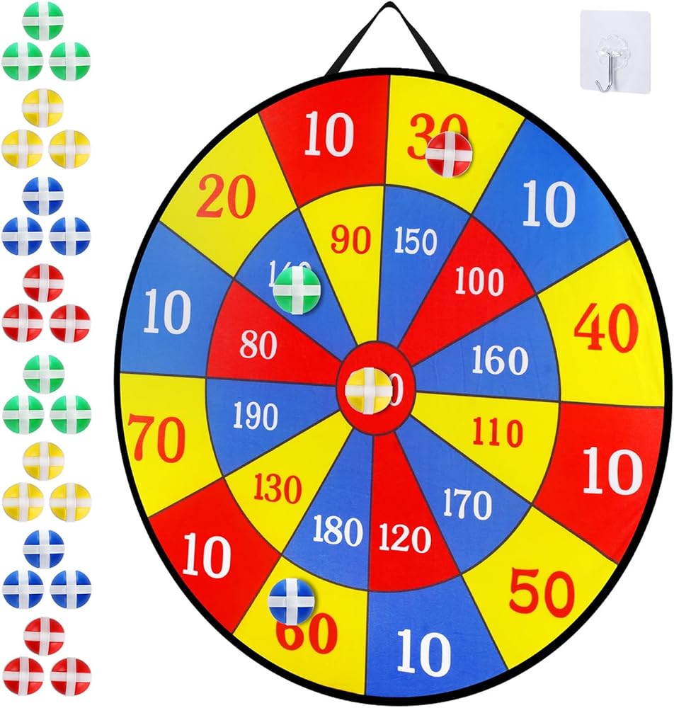 • Package includes: Package comes with 1 piece 29" dart board, 24 pieces sticky balls in 4 colors and 1 piece stick hook, enough quantity for you to play with your friends or families