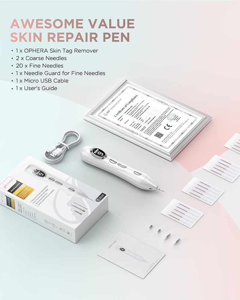 [Replaceable Needle & Easy to Use] OPHERA Skin Tag Removal Kit Provide two different needles, fine needle removes small mole, spot, freckle and skin tag. And coarse needle is advanced in removing large mole, spot, wart and tattoo. The plasma pen comes with a spotlight that illuminates the area you're working on. You can check the intensity level and battery level on the digital display. With 6 easy-to-follow steps, your skin will be rejuvenated in 15 minutes.