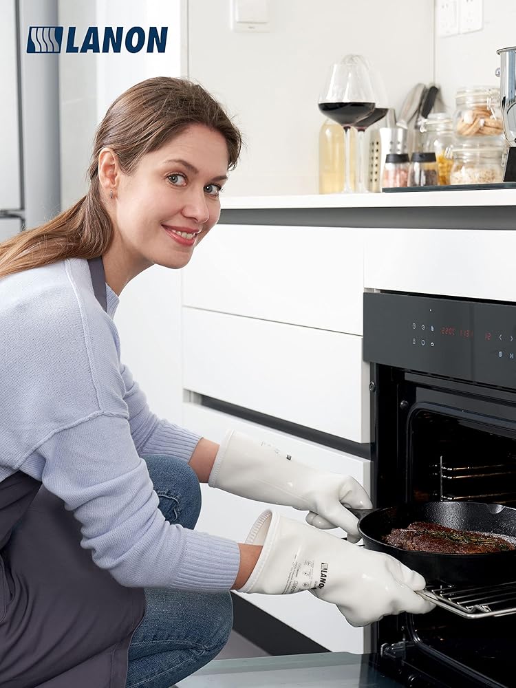 LANON Liquid Silicone Gloves, Heat Resistant Oven Gloves with Fingers, Food Grade, Waterproof, White, Large
