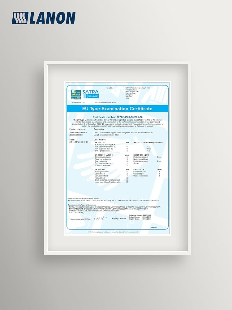 • أداء المستوى التالي - قفازات فرن LANON لحماية اليد معتمدة من قبل CE 2777، مع معايير EN 388:2016، EN 420، EN ISO374-5:2016، EN ISO374-1:2016/النوع B، EN407:2004، EN511:2006، وتلبية لوائح CA Prop.65 لـ الفثالات. كما أنها اجتازت اختبار المتطلبات المحددة من قبل إدارة الغذاء والدواء الأمريكية 21 CFR 175.300 والاتحاد الأوروبي.
