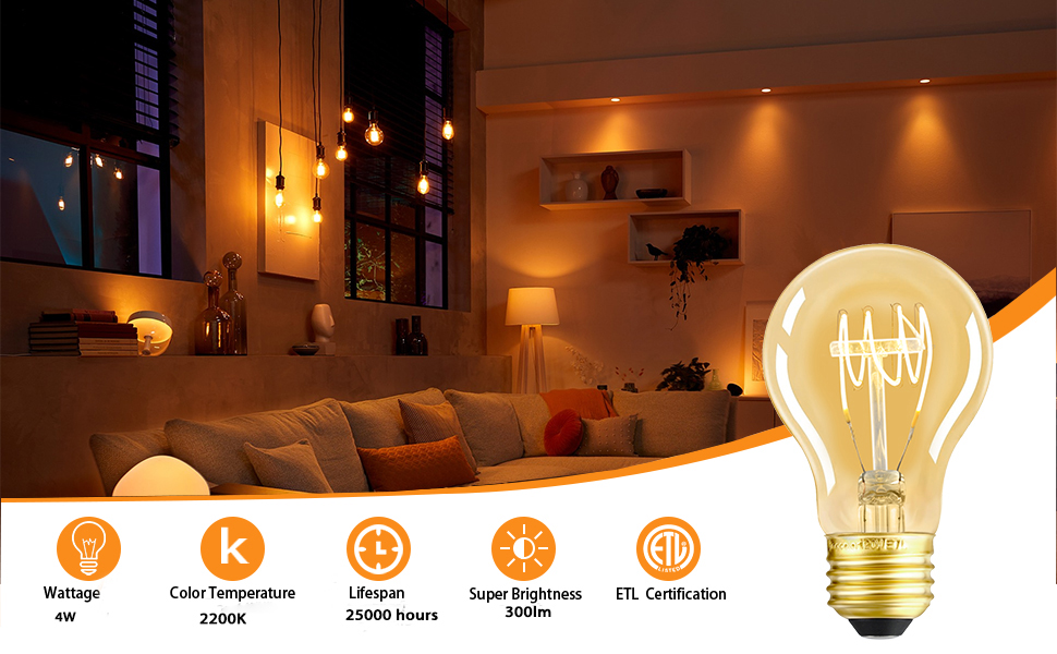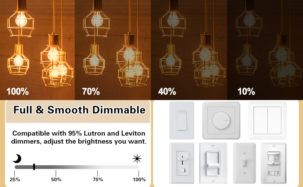 قابلة للتعتيم لأجواء مثالية: مصابيح Edison ذات القاعدة المتوسطة A60 متوافقة تمامًا مع مجموعة متنوعة من مفاتيح التعتيم. للحصول على الأداء الأمثل والتعتيم السلس دون وميض، راجع قائمة التعتيم الموصى بها لضمان تجربة إضاءة متسقة
