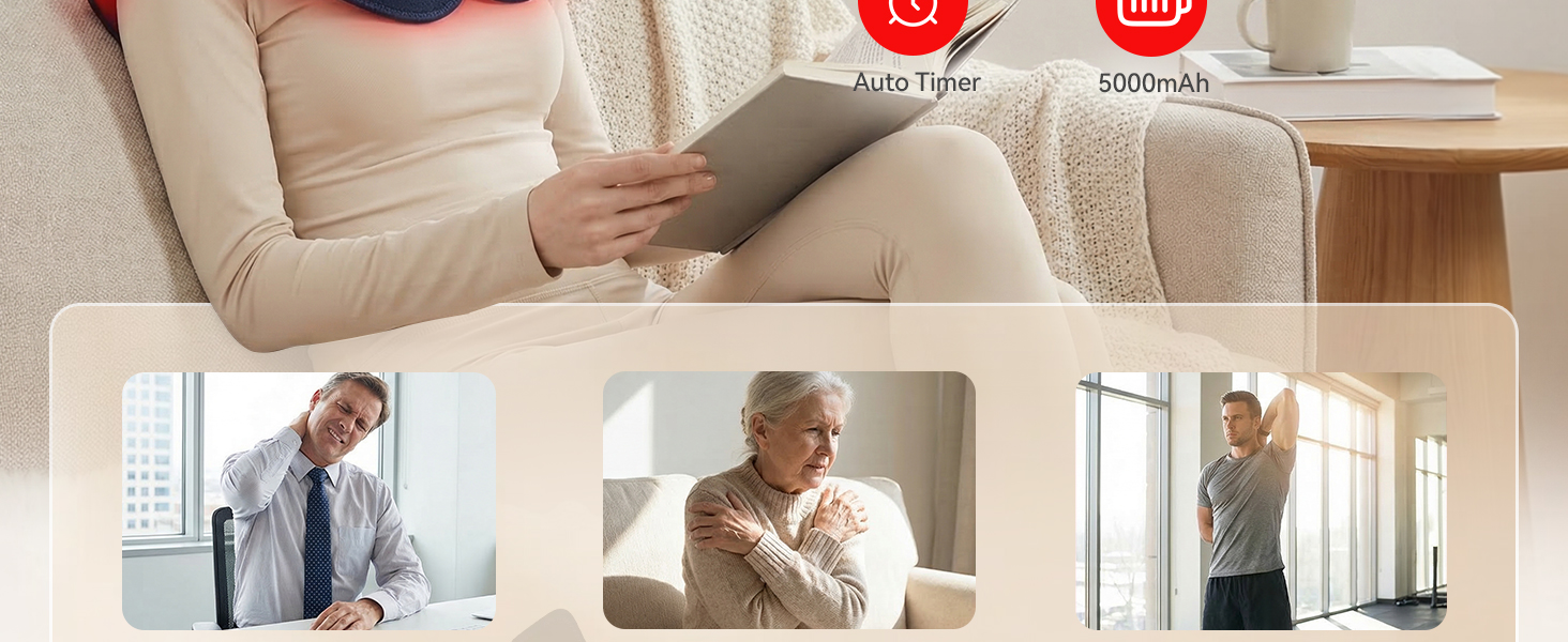 Red Light Therapy for Targeted Relief: Equipped with 104 tri-chip LEDs (660nm red light + 2×850nm infrared light), this infrared therapy wrap delivers deeper and more even light coverage compared to basic devices, helping ease neck stiffness, relax shoulder tension, support circulation, and promote faster muscle recovery after long hours of work or physical activity.