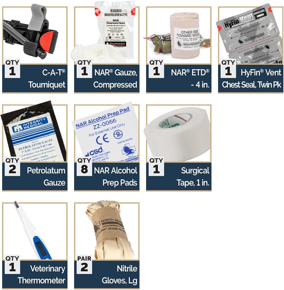 • KIT CONTENTS: C-A-T Tourniquet, HyFin Vent Chest Seals, 4" ETD Emergency Trauma Dressing, NAR Compressed Gauze, Petrolatum Gauze, Alcohol Prep Pads, Pair Bear Claw Nitrile Gloves LRG, Surgical Tape, Digital Vet Thermometer