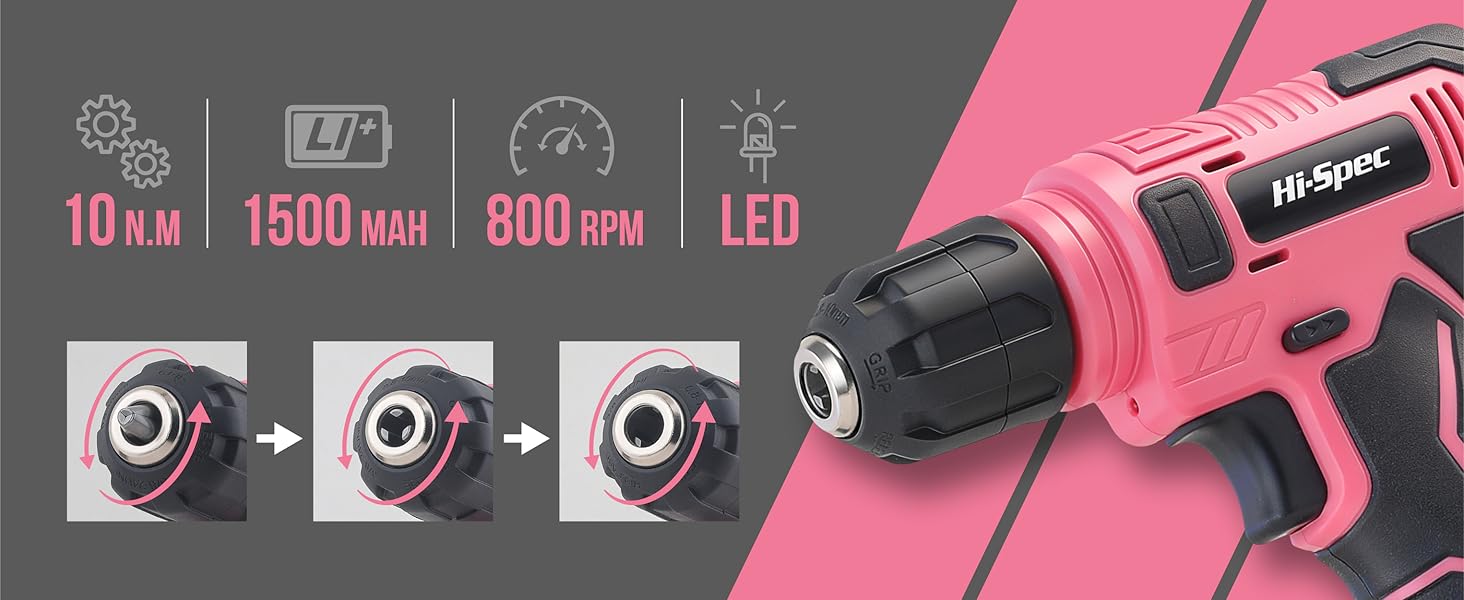 مجموعة مفك المثقاب الكهربائي الوردي: مفك مثقاب كهربائي سريع قابل لإعادة الشحن عبر USB مع لقم الحفر وفك البراغي؛ حفر الإطارات وتعليق الصور وإنهاء الإصلاحات. ملحوظة: غير مناسب للطوب والخرسانة والمعادن الصلبة أو البلاط