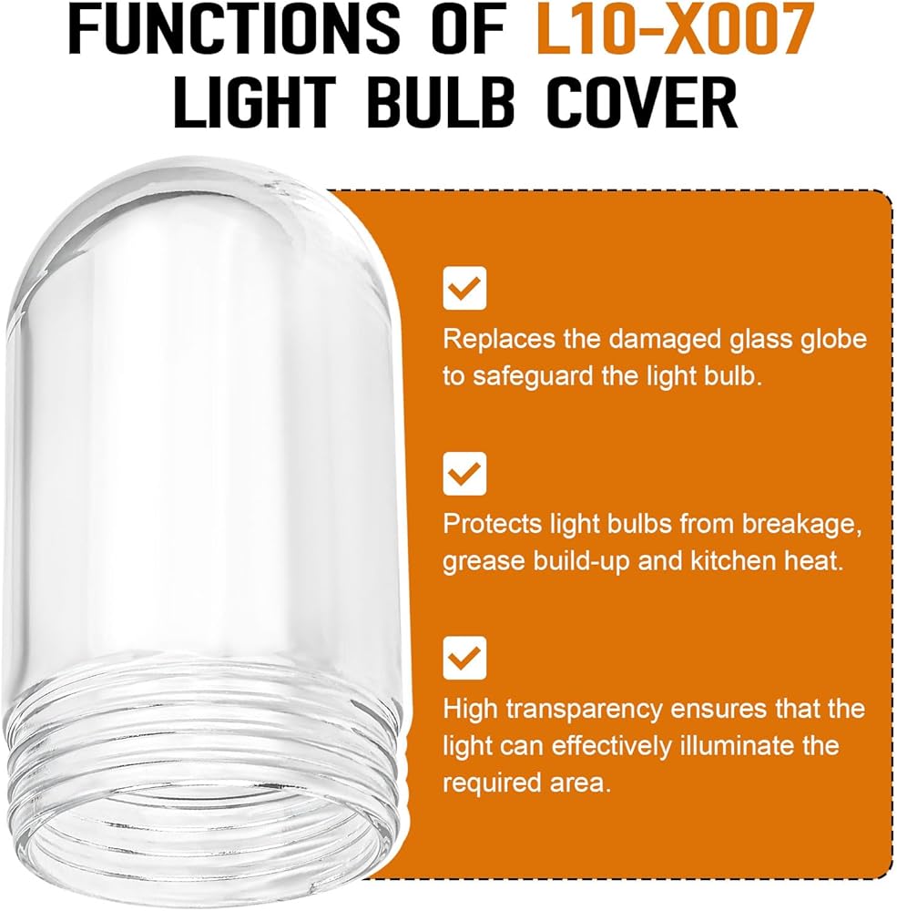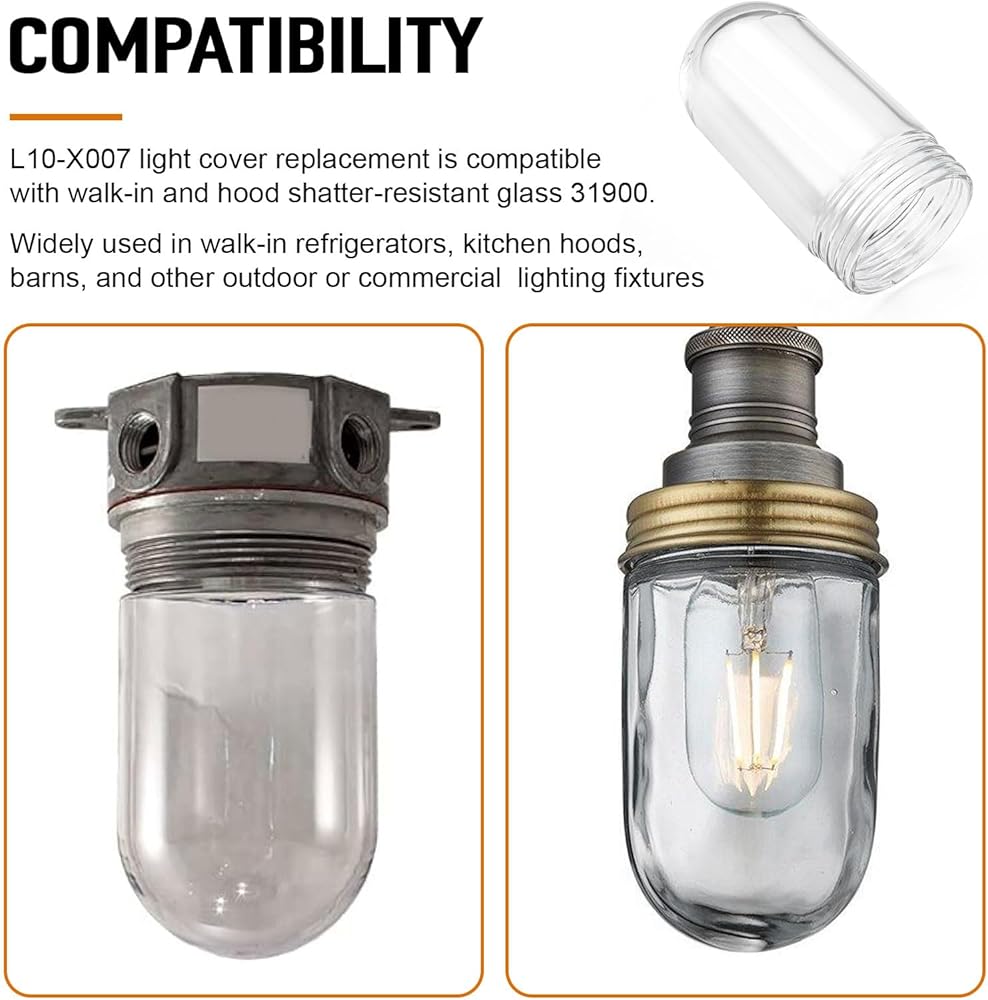 【Compatibility】Part number L10-X007. Our glass light bulb cover is compatible with walk-in and hood shatter-resistant glass 31900. Versatile and ideal for kitchens, barns, garages, and other outdoor or commercial spaces, it serves as a reliable replacement for the glass globe included with a variety of equipment models.