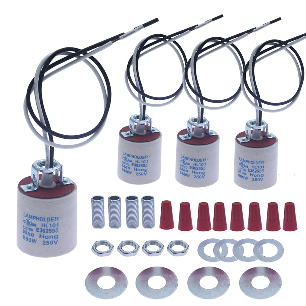 E26 E27 Ceramic Light Socket Standard Medimun Base Screw Lamp Holder Bulb Socket with 12" Wire Lead for Halogen Incandescent Led Light Bulbs Replacement (4pcs)