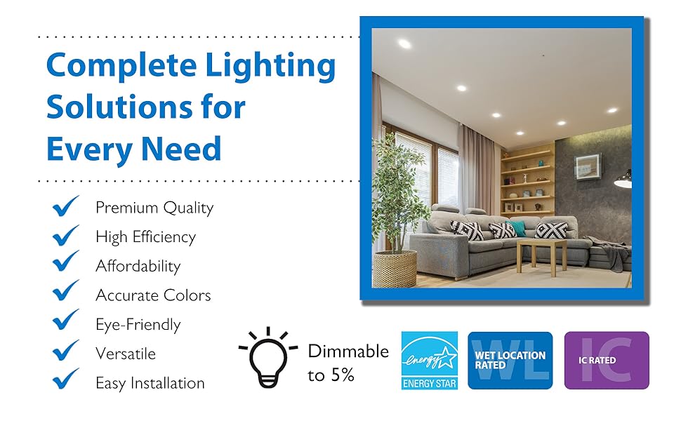 High Performance and Efficiency: Delivering 918 lumens at 10.3W and 120V, this LED ceiling light provides sufficient brightness at lower power. Our recessed lights are also dimmable up to 5% using standard TRIAC or ELV dimmers.