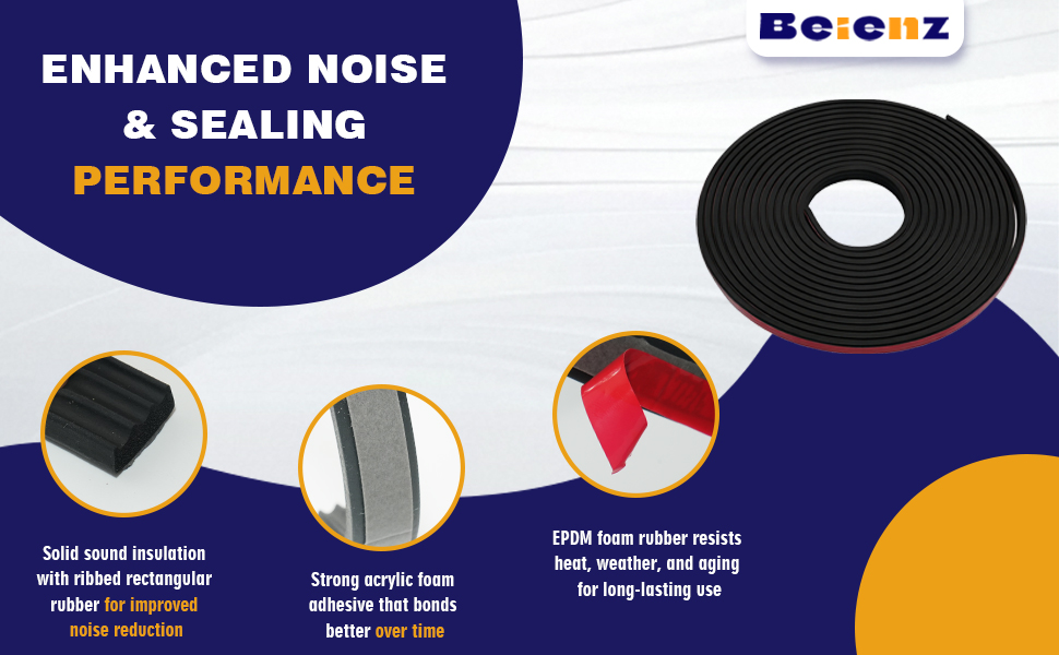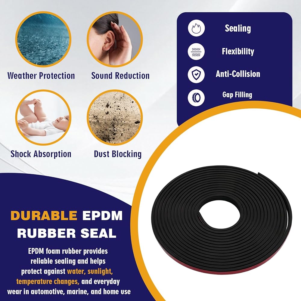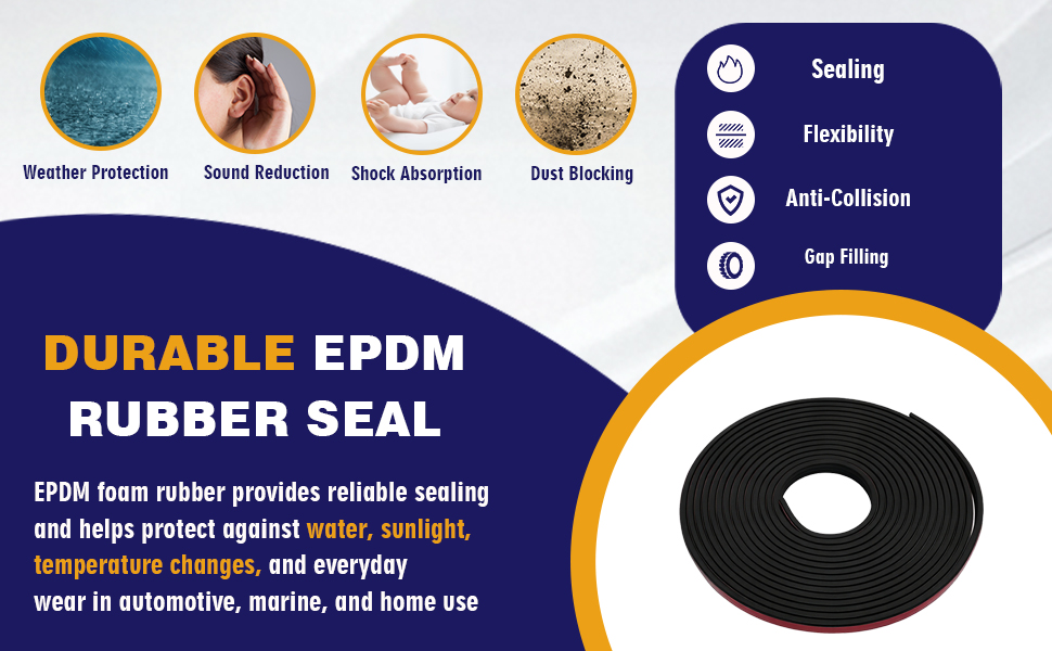 • مادة EPDM المتينة: هذا الشريط المطاطي للطقس مصنوع من إسفنج EPDM المرن المصمم للتعرض الخارجي طويل الأمد. إنه يحافظ على الهيكل تحت الحرارة والبرودة وأشعة الشمس، مما يجعله مناسبًا لاحتياجات منع تسرب المركبات والمنزل.