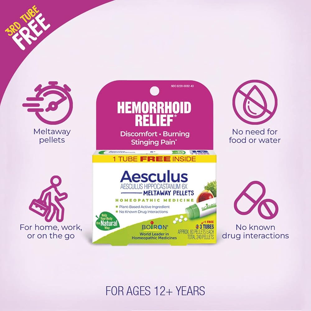 Customize your care with Boiron single medicines for highly targeted relief. Aesculus hippocastanum 6X, made with a plant-based active ingredient, is an oral homeopathic medicine that targets symptoms of hemorrhoids such as burning and stinging pain, discomfort.* It is convenient, discreet, and has no known interactions with other medications, herbs, or supplements. The meltaway pellets dissolve under the tongue without water and come in easy dispensing tubes to take on the go. The Aesculus Bonus Pack offers great value, including three tubes of pellets for the price of two, with a total of 48 doses. Made using the highest quality ingredients and sustainable practices, this hemorrhoid relief medicine has no artificial sweeteners, flavors, colors, or preservatives. Boiron's line of personal care bonus packs also includes Caulophyllum for menstrual cramp relief* and Causticum for incontinence relief.* *Claims based on traditional homeopathic practice, not accepted medical evidence. Not FDA evaluated.