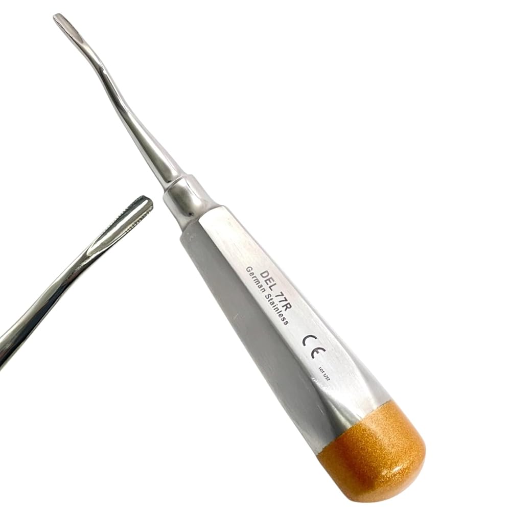 Includes: 1 Each - #77R Dental Elevator with Slight Offset Bent Tip, Colored-End Hollow Handle - German Stainless Steel. Premium German Stainless Steel: Manufactured from German stainless steel for exceptional durability, corrosion resistance, and long-lasting performance. Ensures the instrument withstands repeated sterilization and maintains its integrity over time. Slight Offset Serrated Tip: The uniquely designed tip with a slight offset angle provides optimal access and engagement with the tooth, facilitating efficient luxation and minimizing trauma to surrounding tissues. The serrations offer a secure grip without excessive force. Hollow, Lightweight Handle: The hollow handle design significantly reduces the instrument's weight, minimizing hand fatigue during prolonged procedures and improving tactile sensitivity. This lightweight construction enhances control and precision. Colored Handle End: The colored end not only enhances the instrument's aesthetics but also allows for quick and easy identification within your instrument set, saving valuable time during procedures.
