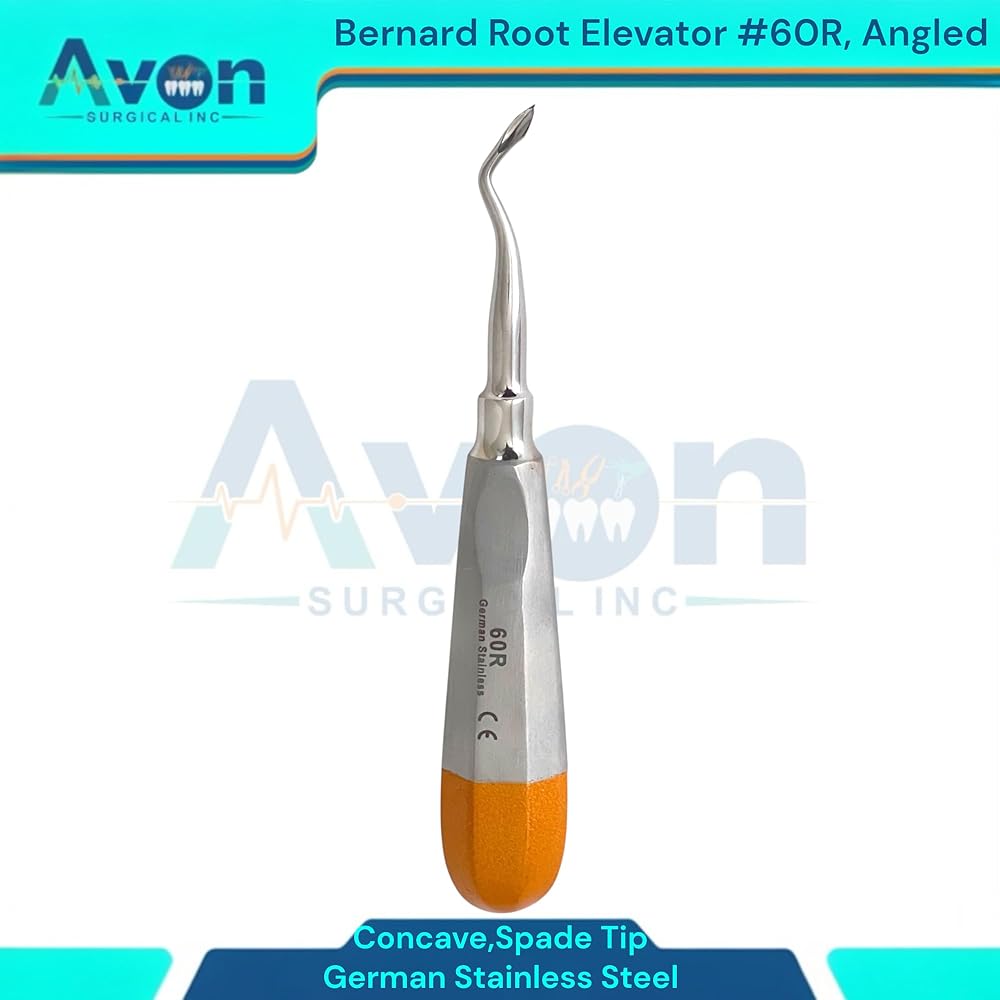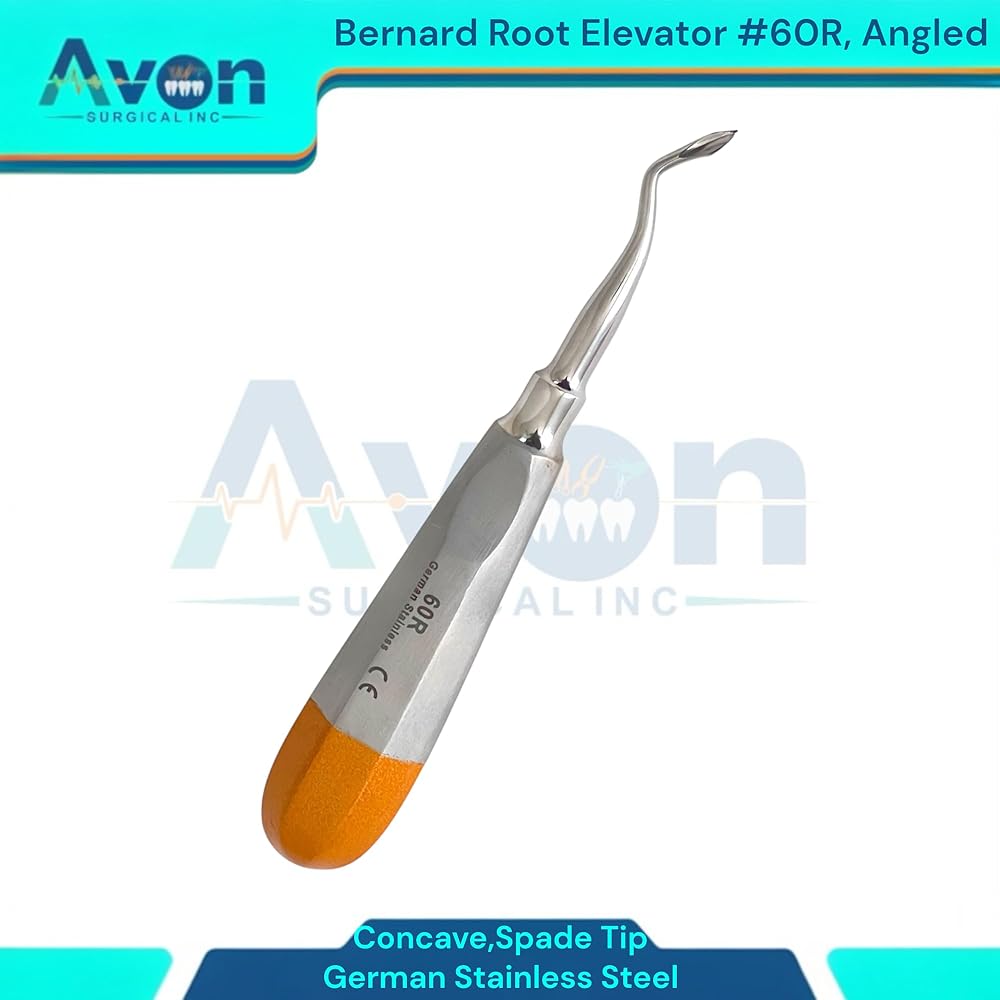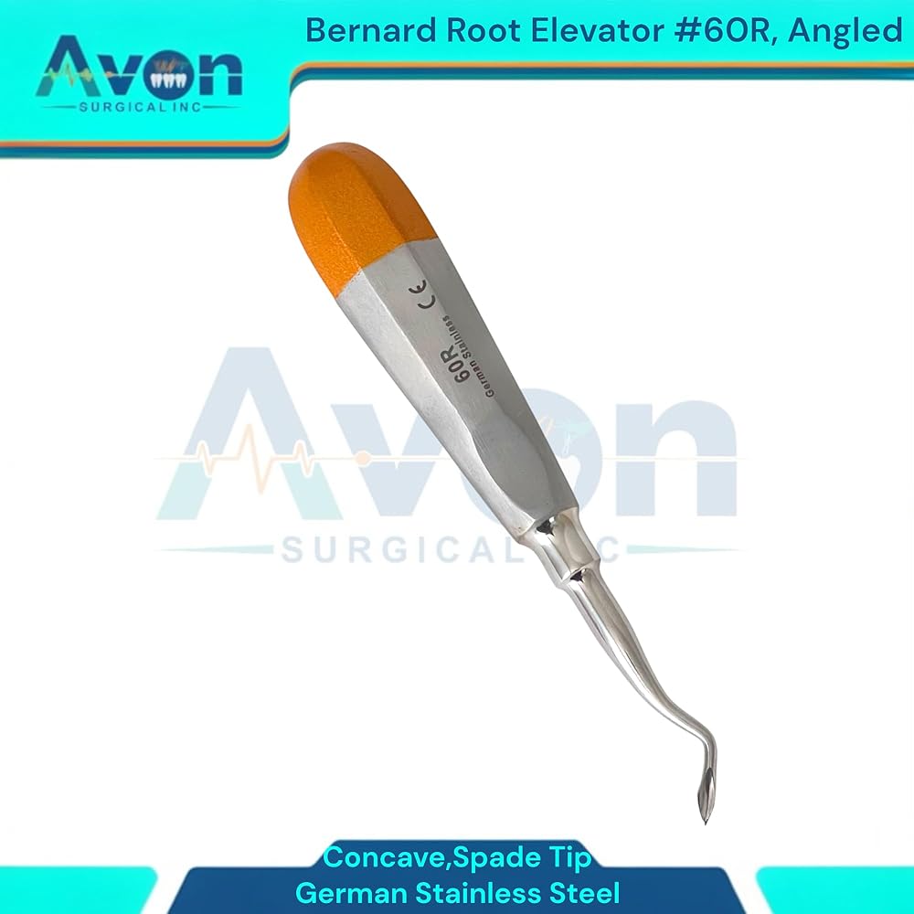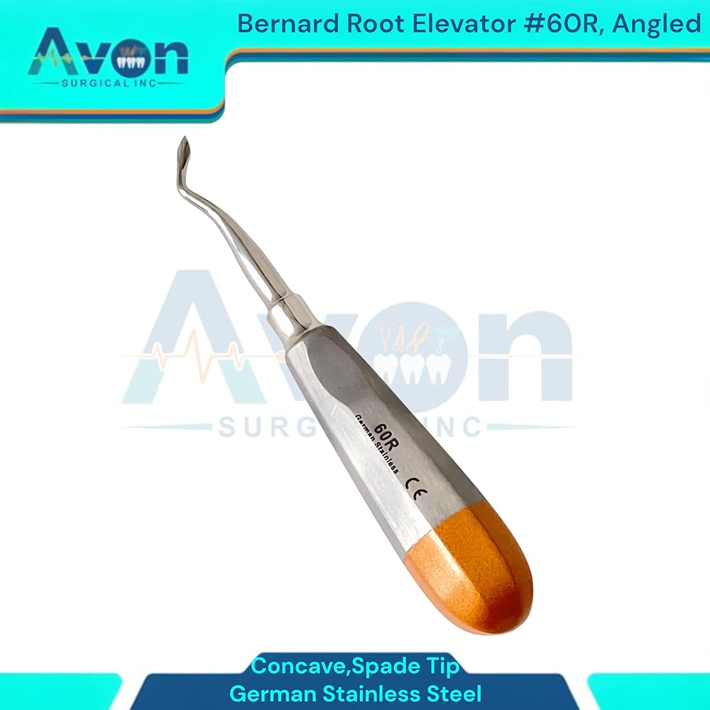 • Includes: 1 Each - #60R Bernard root dental elevator, spade concave tip, angled, color-coded hollow-handle - German stainless steel.