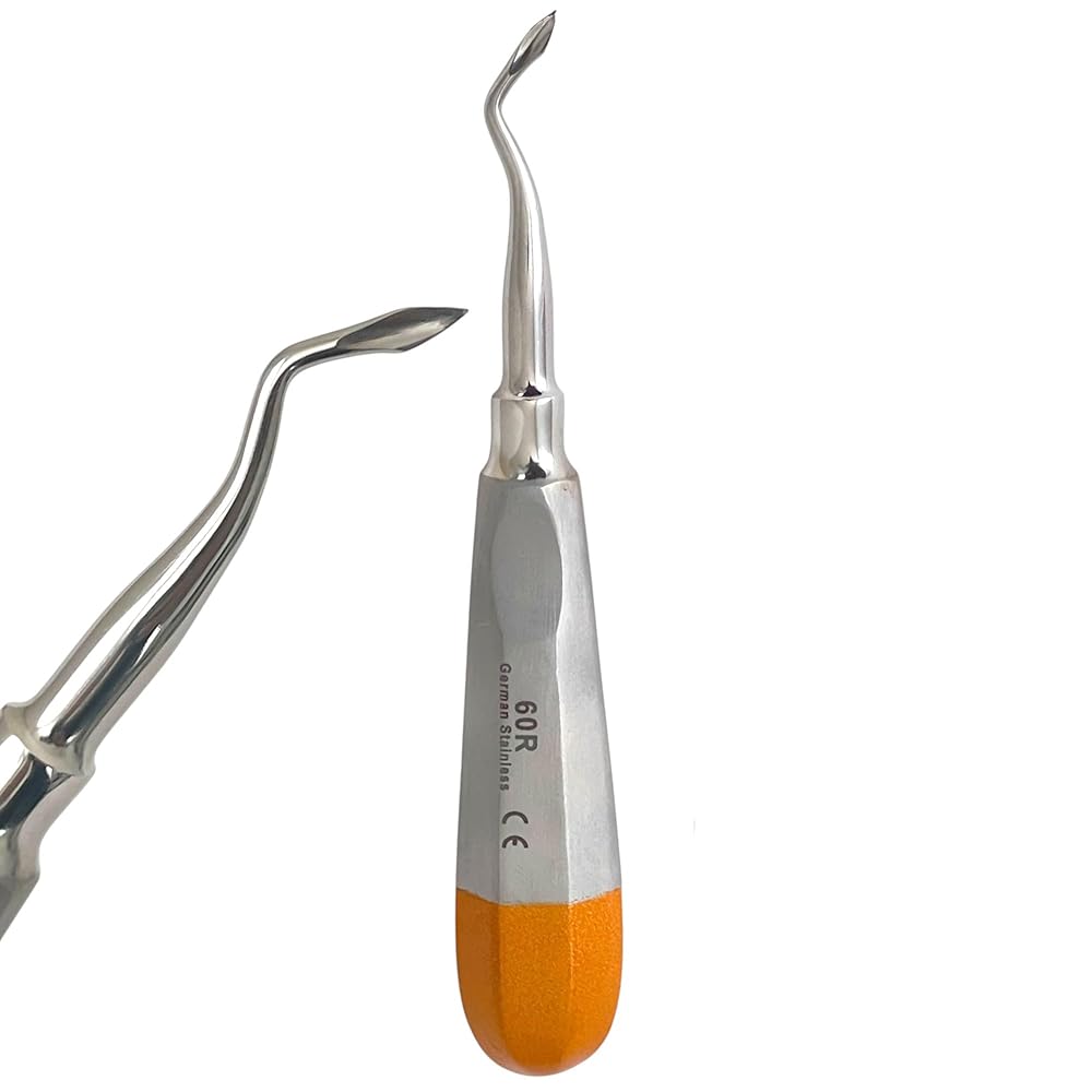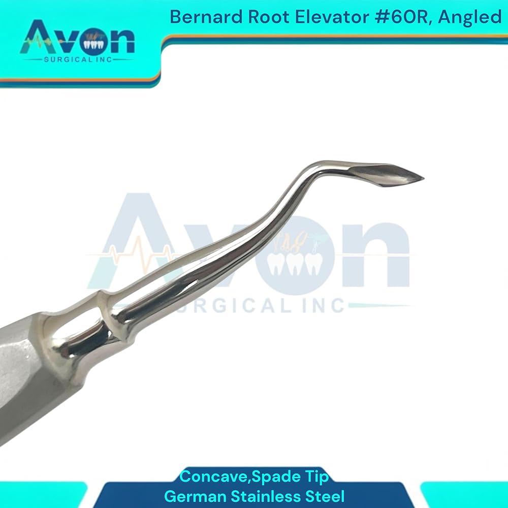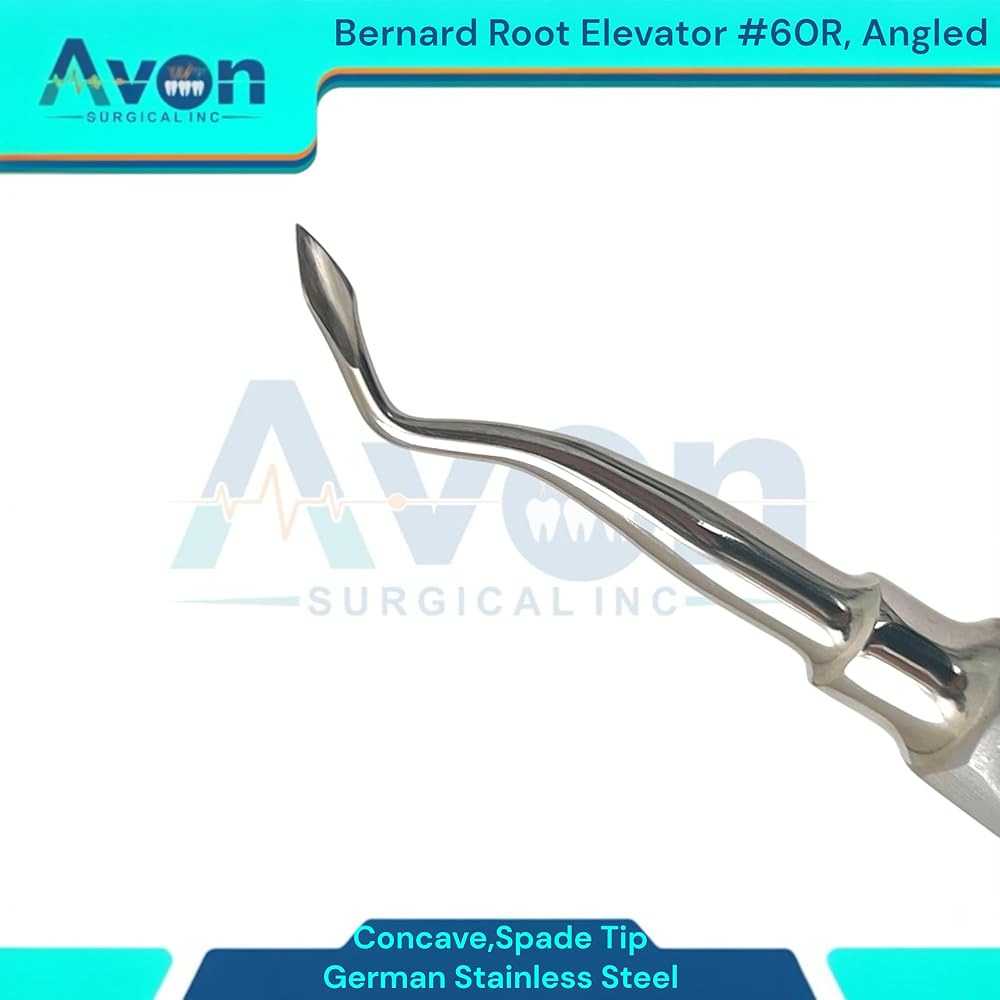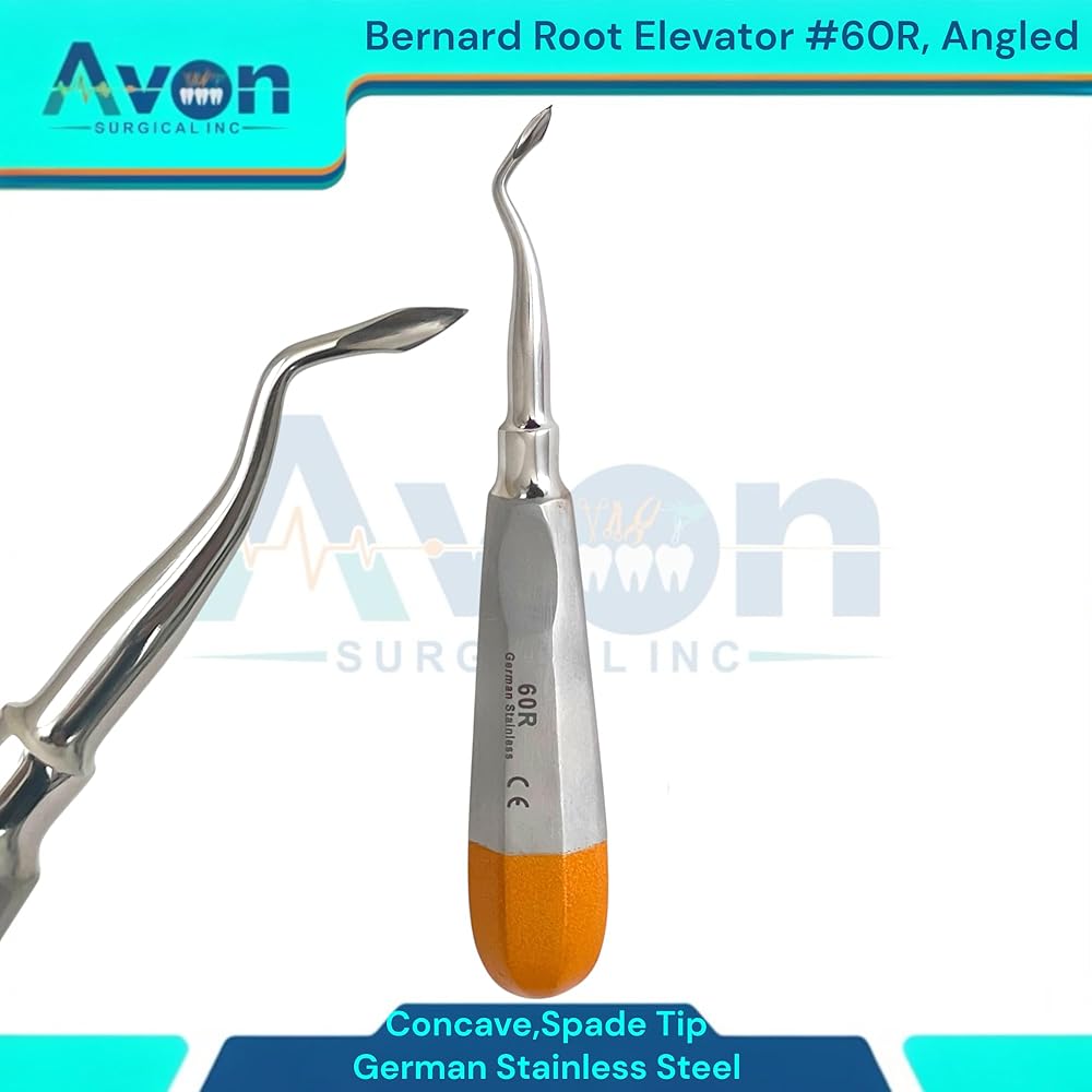 • Includes: 1 Each - #60R Bernard root dental elevator, spade concave tip, angled, color-coded hollow-handle - German stainless steel.