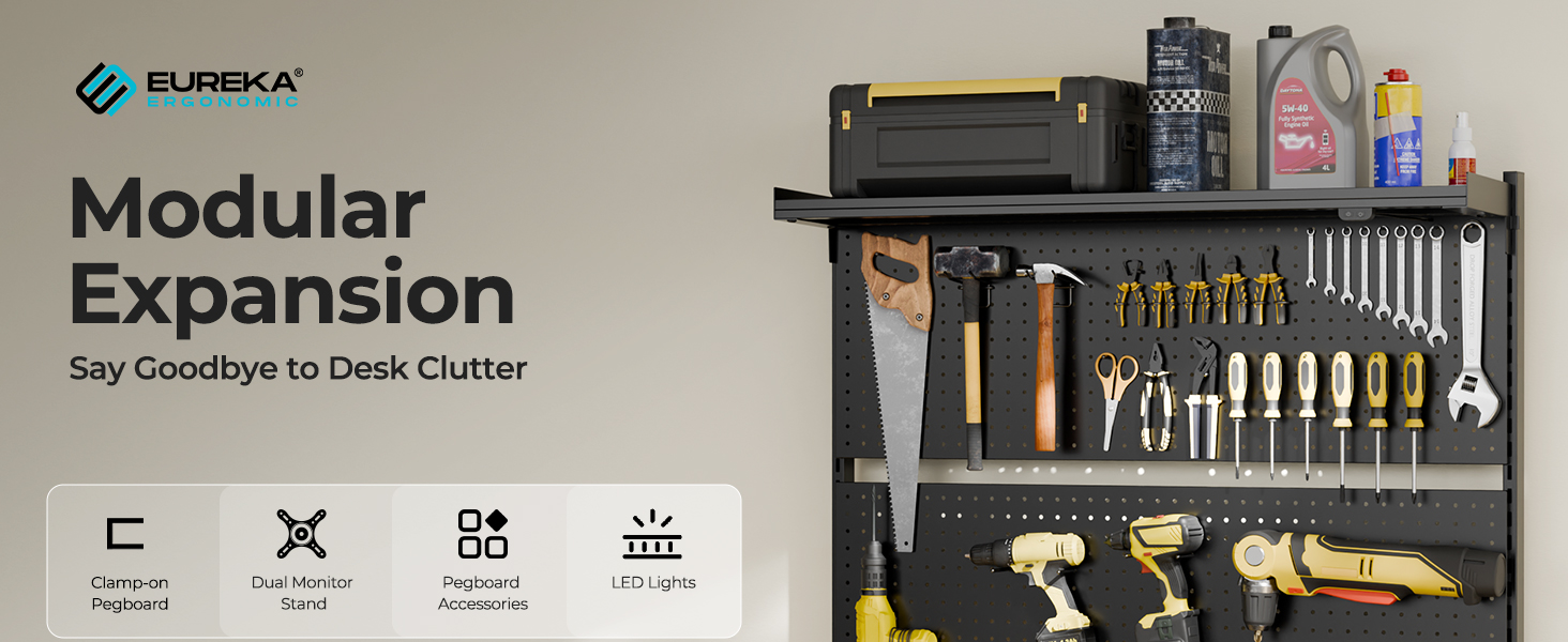 𝐂𝐥𝐚𝐦𝐩-𝐎𝐧 𝐃𝐞𝐬𝐢𝐠𝐧, 𝐓𝐨𝐨𝐥-𝐟𝐫𝐞𝐞 𝐈𝐧𝐬𝐭𝐚𝐥𝐥𝐚𝐭𝐢𝐨𝐧 — EUREKA Clamp-on desk pegboard installs in minutes without drilling. Securely clamps to most standard desks to free up desktop space, cut clutter and improve office organization — ideal for workspace organizers and home offices.