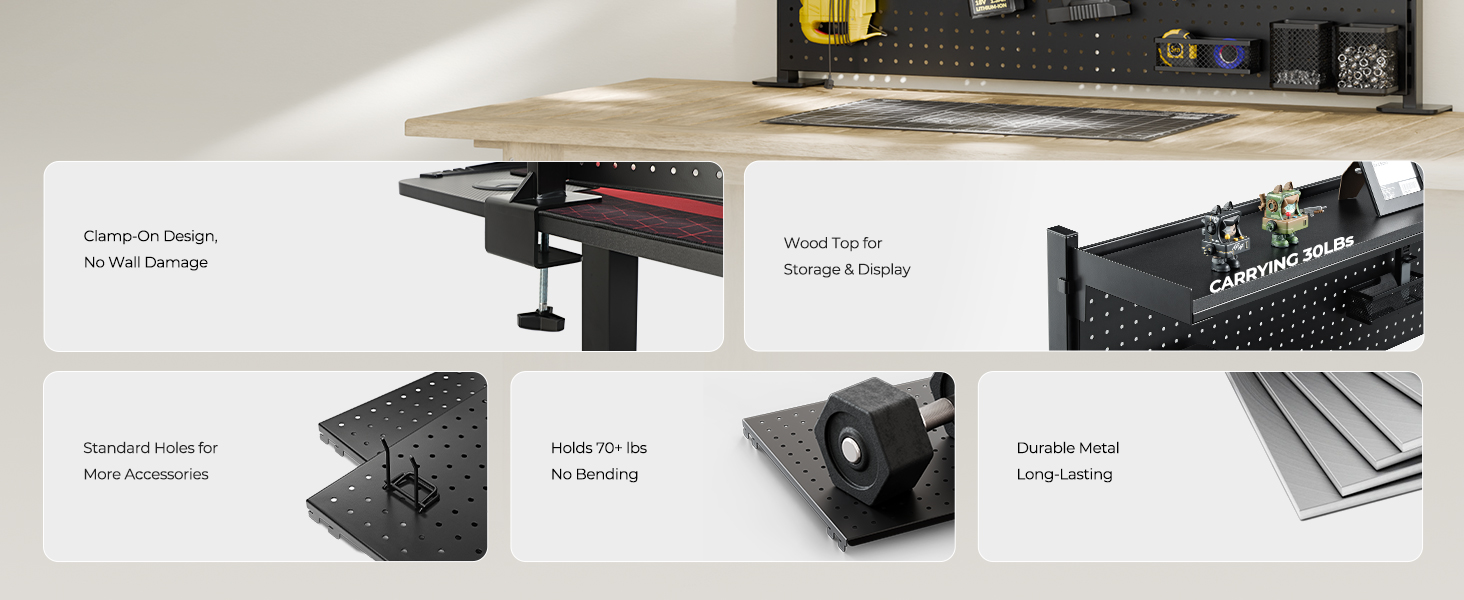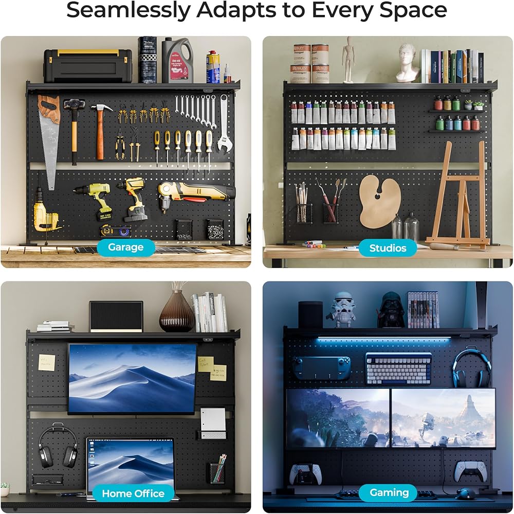 𝗠𝗼𝗱𝘂𝗹𝗮𝗿 𝗣𝗲𝗴𝗯𝗼𝗮𝗿𝗱 𝗔𝗰𝗰𝗲𝘀𝘀𝗼𝗿𝗶𝗲𝘀 & 𝗗𝗲𝘀𝗸 𝗦𝗵𝗲𝗹𝘃𝗲𝘀 — Includes versatile pegboard accessories, hooks and removable desk shelves. Standard peg board hole spacing accepts most third-party pegboard accessories so you can customize for tool storage, game controllers, or craft room supplies.