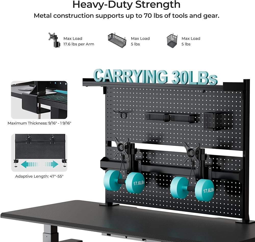 𝗛𝗲𝗮𝘃𝘆-𝗱𝘂𝘁𝘆 𝗠𝗲𝘁𝗮𝗹 𝗣𝗲𝗴𝗯𝗼𝗮𝗿𝗱 𝗖𝗼𝗻𝘀𝘁𝗿𝘂𝗰𝘁𝗶𝗼𝗻 — Powder-coated steel panel and reinforced hardware deliver long-lasting durability; the system supports up to 70 lbs combined. Perfect as a garage pegboard or mounted over a workbench for rugged tool storage and workshop organization.
