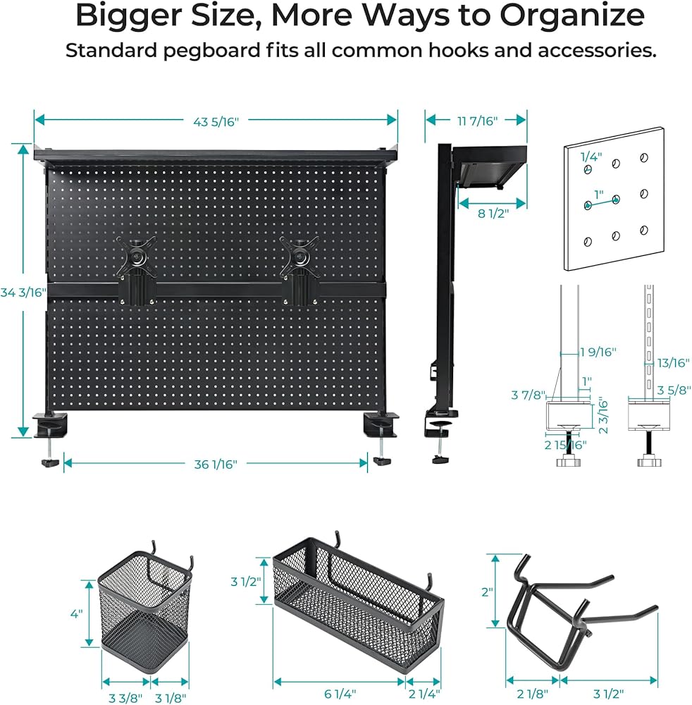 EUREKA ERGONOMIC Metal Pegboard, 43x34inch Clam on Desk Pegboard with Dual Monitor Stand, Garage Pegboard with 4 Accessories, Desk Shelves for Tool organizer, Office, Gaming Desk, Workbench, Black