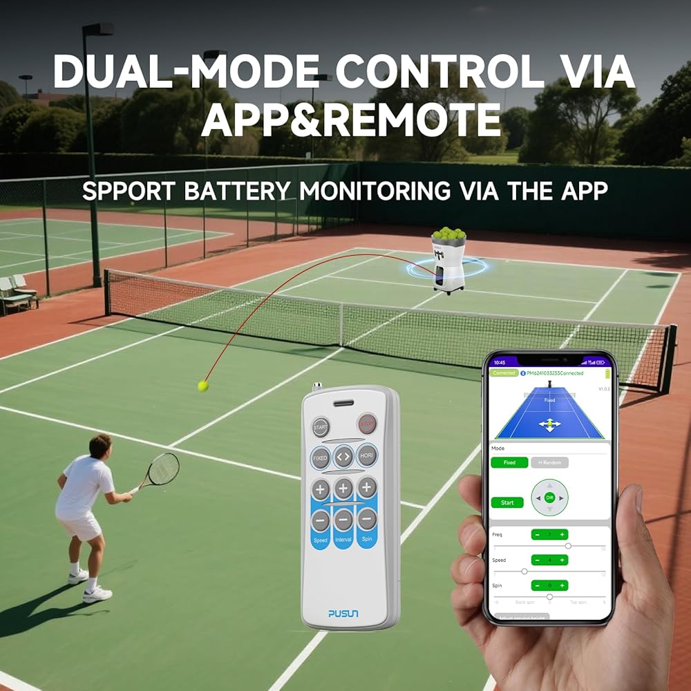 🎾🎾Smart App Control: This tennis ball machine can be control with Smart App, easily and freely adjust the frequency, speed, rotation, depth, random mode and etc. Pusun Sport offers you an intelligent tennis machine for you to enhance your skills on the court.