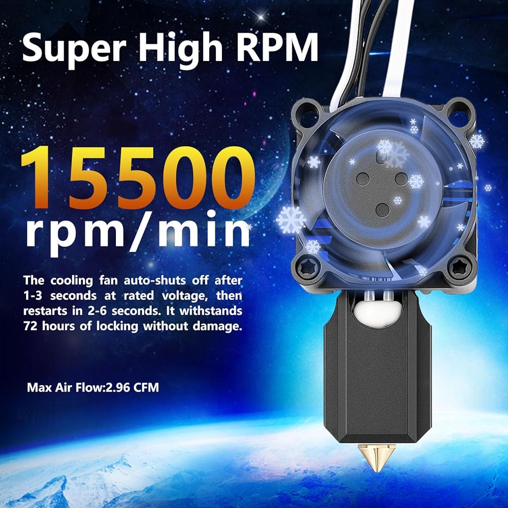• 【Safety Cooling Fan】The cooling fan for hotend has an auto-shutoff function while being locked at rated voltage for 1-3 seconds. The circuit attempts torestartin 2 to 6 seconds. There is no damage after 72 hours of locking, Hassle - free installation。