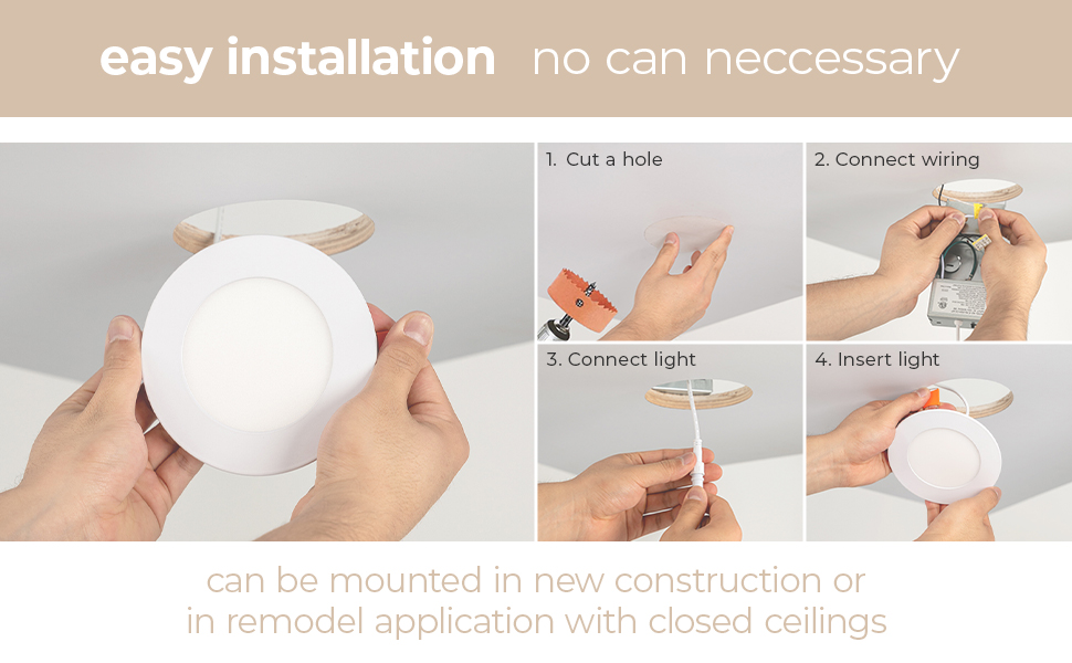 • التثبيت: سهل العمل مع الأسلاك - يمكن تركيبه في كل من تطبيقات البناء الجديدة حيث تكون العوارض الخشبية مكشوفة أو في تطبيق إعادة التشكيل حيث تكون الأسقف مغلقة. اقطع فتحة في السقف باستخدام قالب الفتحة 1:1 المتوفر؛ قم بتوصيل صندوق التوصيل بالكابل؛ استخدم المشبك الزنبركي لتثبيته في مكانه على السقف. بدون متاعب، يمكن إكمال التثبيت في دقائق.