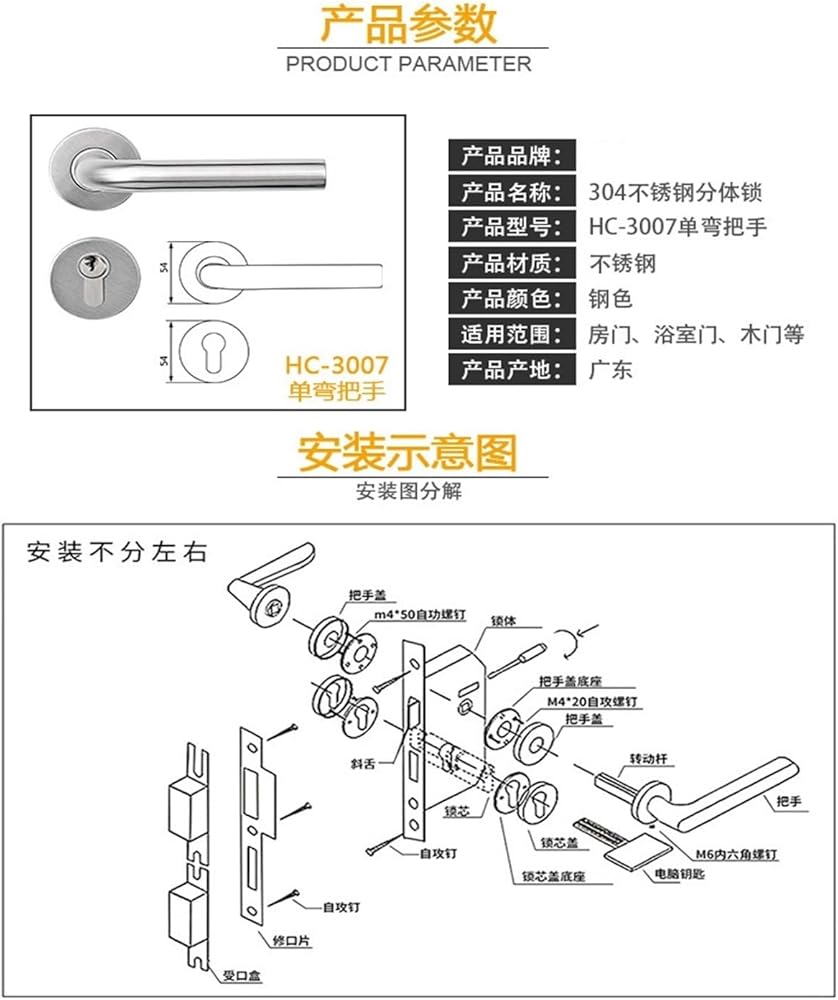 304 الفولاذ المقاوم للصدأ سبليت قفل HC3007 مقبض قفل واحد منحني مقبض داخلي باب مكتب قفل الباب