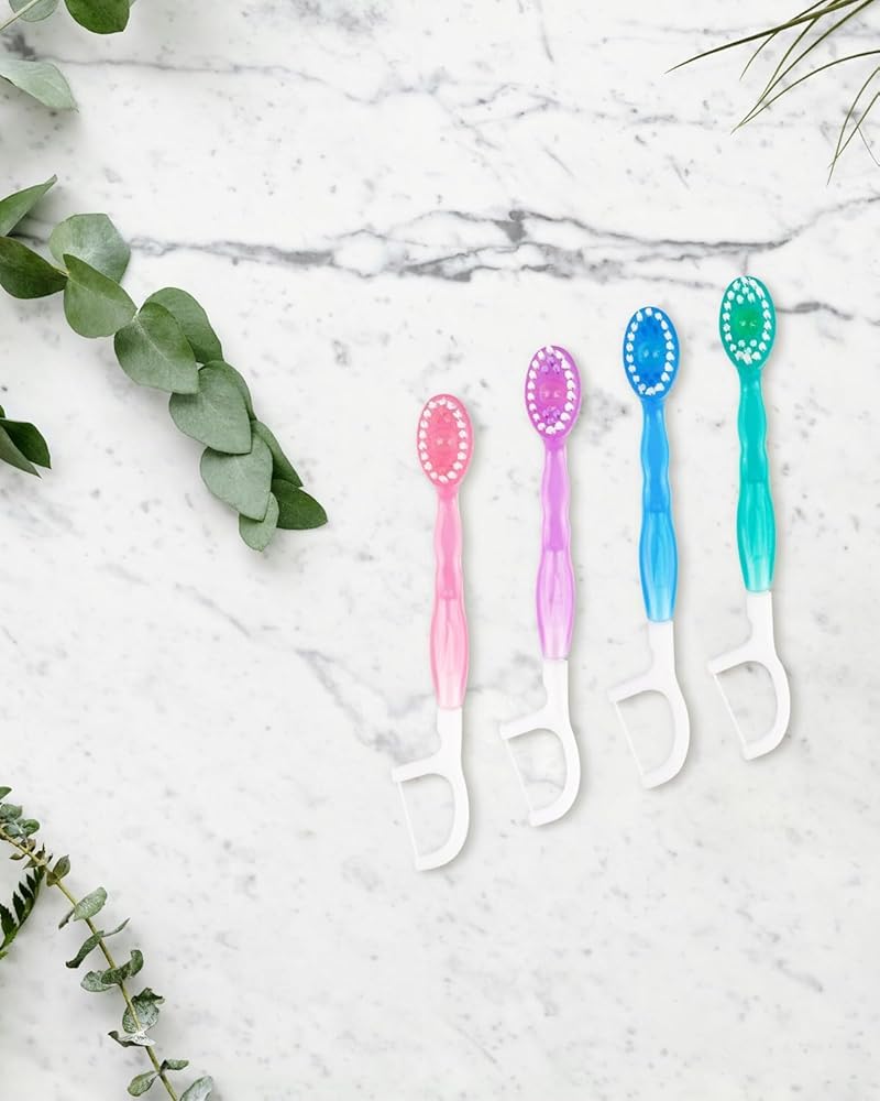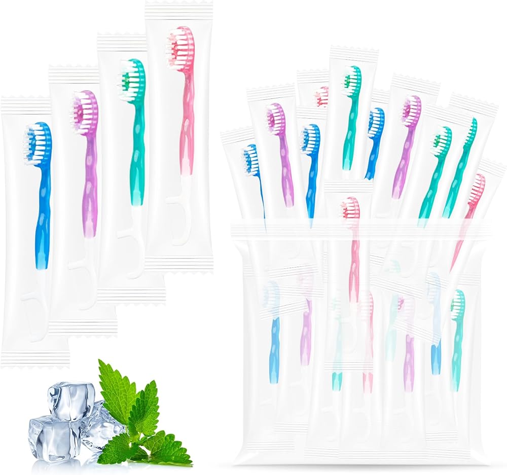 5-in-1 Travel Toothbrush & Floss: Our 24-pack disposable toothbrushes come in four vibrant colors, each individually wrapped for hygiene and convenience. Each toothbrush features toothpaste, floss, toothpick, and tongue scraper for comprehensive oral care on the go