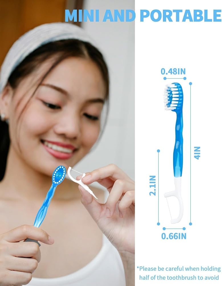 5-in-1 Toothbrush for Quick Oral Care: This 5-in-1 toothbrush set includes a toothbrush, floss, toothpaste, toothpick, and tongue scraper, all in one compact tool. Perfect for quick clean-ups, ensuring fresh breath and healthy teeth wherever you are