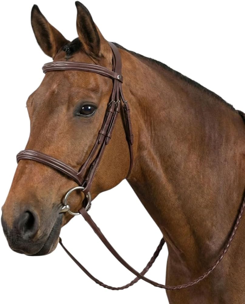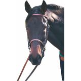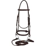 The Henri de Rivel Advantage Raised Fancy Stitched Snaffle Bridle is beautiful, traditional, and economical. Finely crafted with durability and versatility in mind, the Advantage bridle is made to last and be a staple in your tack trunk. This bridle features white detail stitching on the nose and brow bands. Made from quality, imported leather and stainless steel hardware. Complete with laced reins, this bridle is ready to be used! Dimensions: 5/8" nose and brow band, 1/2" cheek pieces, 5/8" laced reins. *Bit shown in image not included*