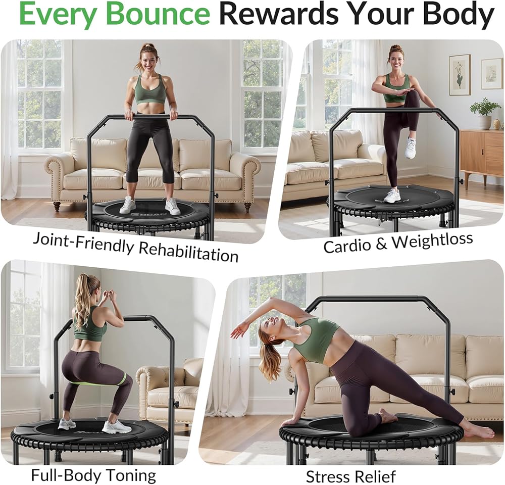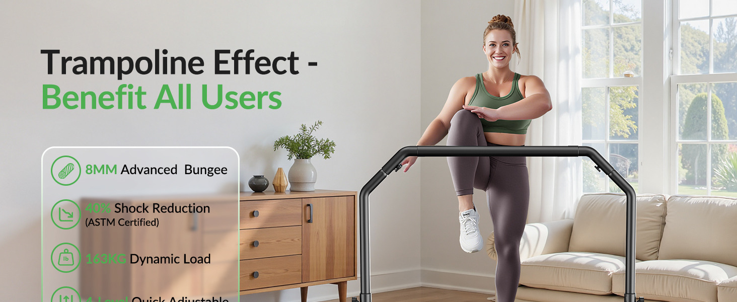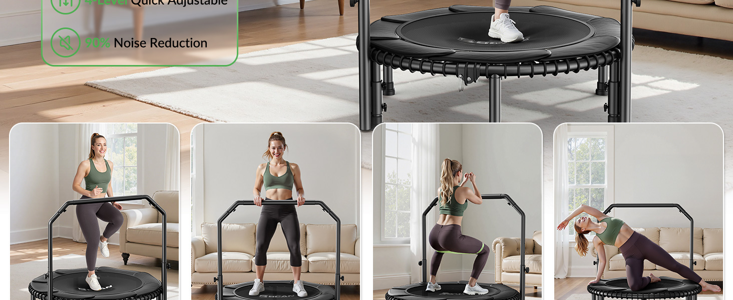 • مقبض قابل للتعديل بأربعة مستويات: معدات الترامبولين للياقة البدنية مع مقود قابل للتعديل بارتفاع 4 مستويات يتراوح من 2'6" إلى 3'5" (على السجادة)، اقفز بثقة