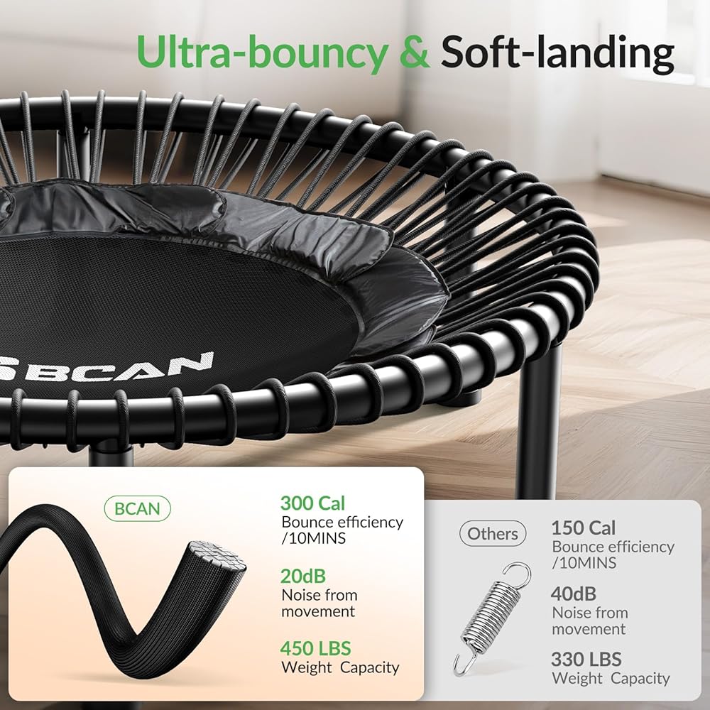 ترامبولين ريبوندر من بي كان للبالغين، ترامبولين للياقة البدنية مع حبل مطاطي، مقبض إسفنجي قابل للتعديل على شكل حرف U، ثابت وهادئ، للتمرين الداخلي والخارجي - أسود