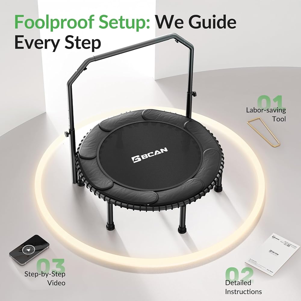 • سهل التجميع إلى حد ما: يأتي ترامبولين اللياقة البدنية من BCAN مجمعًا مسبقًا بنسبة 60%، فقط 10 دقائق لإكمال التجميع باستخدام أداتنا الخاصة