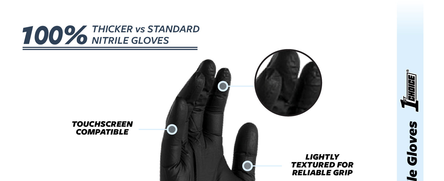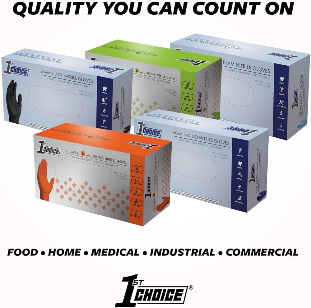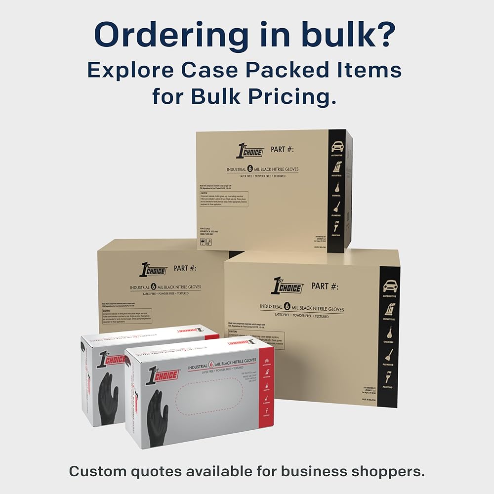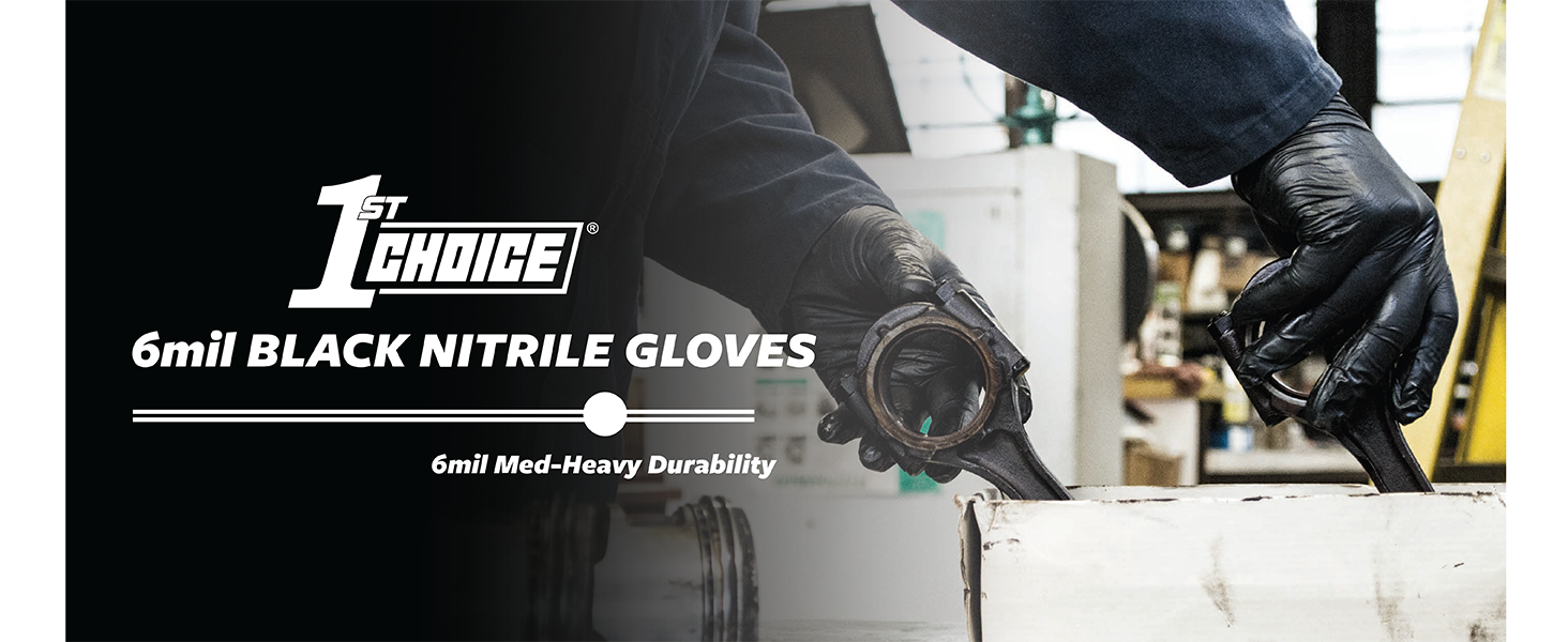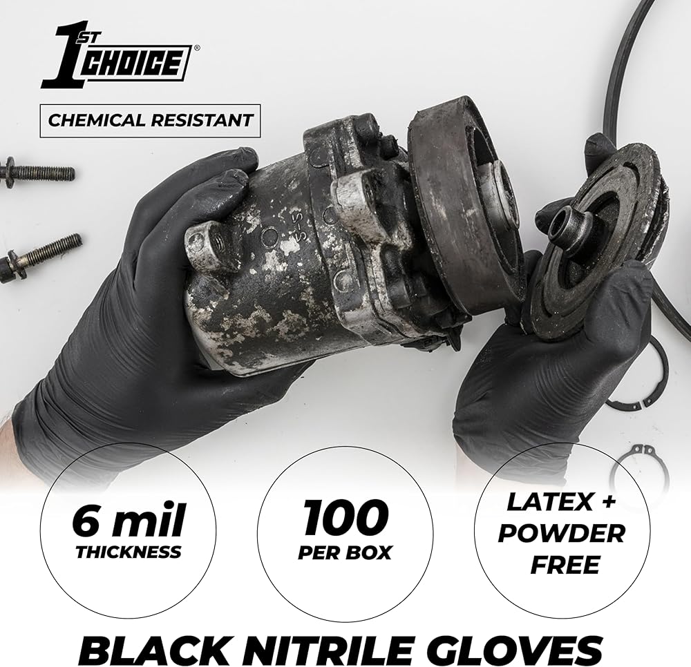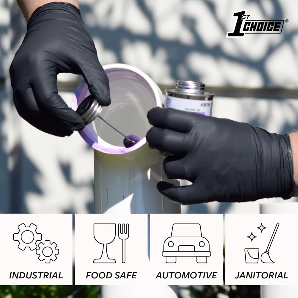 Medium-Duty Protection for Every Task 1st Choice 6 mil black nitrile disposable gloves combine durability, comfort, and versatility, making them an essential addition to any home, garage, or workplace. Crafted from high-quality latex-free nitrile, they're the perfect latex gloves alternative for those with skin sensitivities, while still delivering a snug, comfortable fit. Designed for Work and Life Whether you're detailing cars, working on engines, prepping food for a backyard BBQ, or tackling tough cleaning projects, these black nitrile disposable gloves deliver dependable barrier coverage. The medium-duty 6 mil construction provides the right balance of strength and flexibility—ideal for automotive shops, janitorial crews, food prep, barbers, and home use. Reliable Grip for Messy Jobs A fully textured surface improves grip on wet, oily, or slippery objects, helping you maintain control when it matters most. Use them as kitchen gloves, cooking gloves, BBQ gloves, or mechanic gloves—these gloves are built to handle the demands of everyday life and professional tasks. Versatile Across Industries and Lifestyles From handling household cleaners to managing greasy tools, these powder-free disposable nitrile gloves are popular with barbers, grill masters, caterers, and industrial workers alike. They also serve as reliable chemical gloves for light industrial use and rubber gloves for household chores, offering comfort and protection in one sleek, professional-looking package. Everyday Convenience You Can Count On Ambidextrous, easy to put on, and comfortable for extended wear, these gloves help you get more done with less hassle. The bold black color hides dirt and stains for a clean, professional appearance in any setting. Use them for food prep gloves, disposable kitchen gloves, cleaning gloves, BBQ gloves, or black gloves disposable for industrial projects.