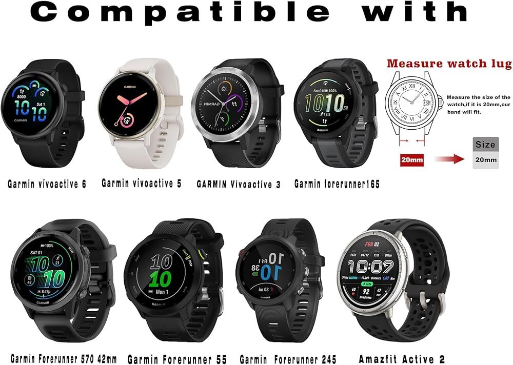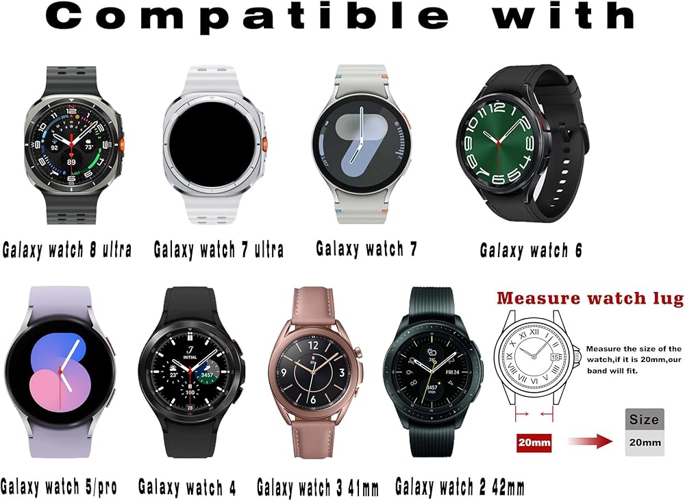 غير متوافقة مع ساعة جالاكسي 3 مقاس 45 ملم، ساعة جالاكسي 46 ملم، جير اس 3. متوافقة مع ساعة سامسونج جالاكسي 5,5 برو، ساعة جالاكسي 4 وساعة جالاكسي 42 ملم، ساعة جالاكسي اكتيف، جير سبورت، جير اس 2 كلاسيك وغيرها من الساعات القياسية بعرض شريط 20 ملم
