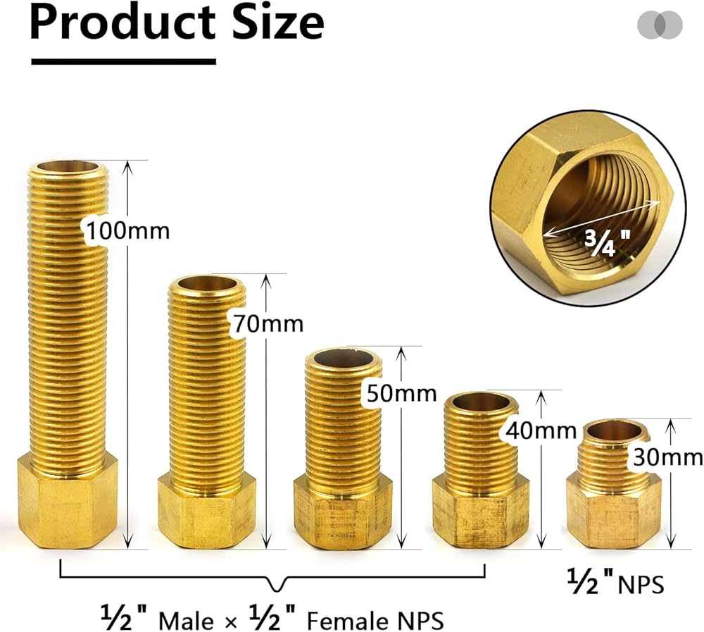 حجم الخيط: 1/2 بوصة ذكر إلى 1/2 بوصة مجموعة تركيب الأنابيب النحاسية للإناث، تنبيه: الطول 30 مم هو خيط NPT (خيط مستدق). تركيبات 40 مم، 50 مم، 70 مم، 100 مم هي خيط NPS (خيط مستقيم)
