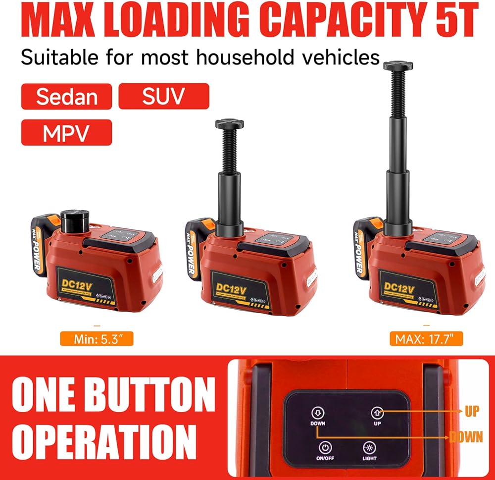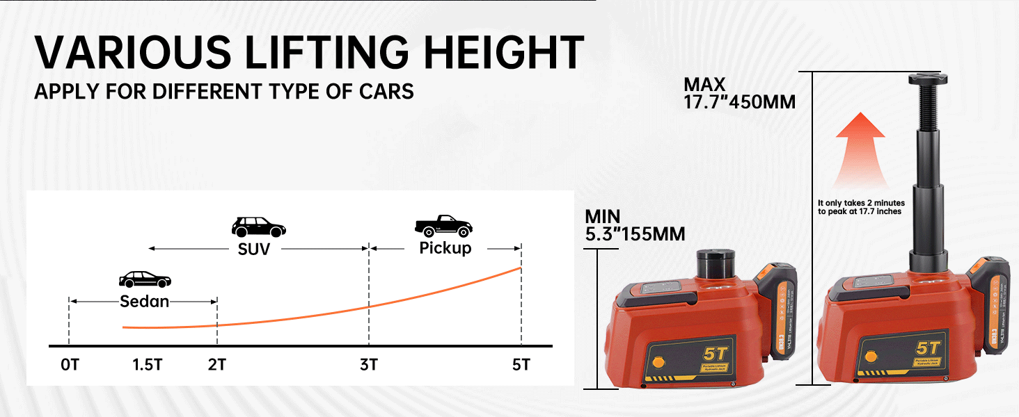 أداء رفع سريع للمركبات التي يبلغ وزنها 5 طن، تم تصميم هذا الرافعة الكهربائية للسرعة والقوة، ويرفع ما يصل إلى 5 أطنان (11,023 رطلاً) في أقل من 90 ثانية. مع نطاق رفع من 5.9 إلى 17.7 بوصة، يمكنه التعامل مع السيارات وسيارات الدفع الرباعي والشاحنات الخفيفة بسهولة. سواء كنت تواجه حالة طوارئ على الطريق أو صيانة روتينية، فسوف توفر الوقت والجهد من خلال عملية رفع موثوقة وعالية الكفاءة.