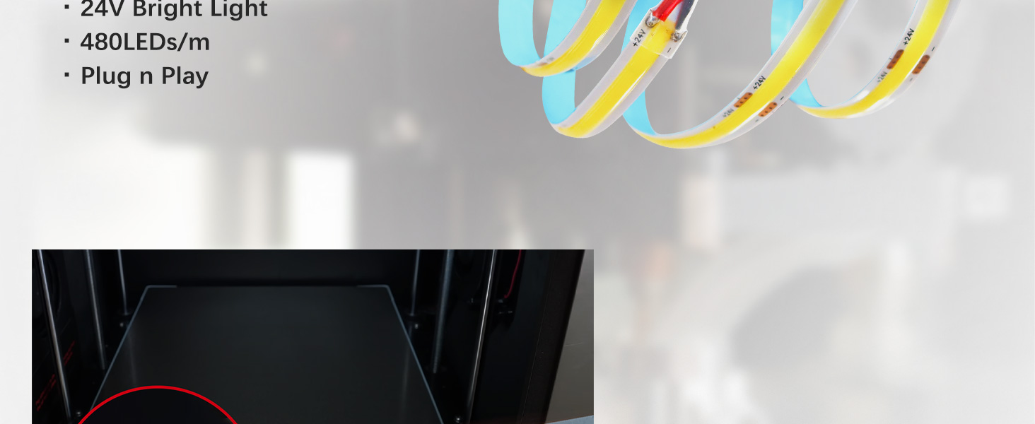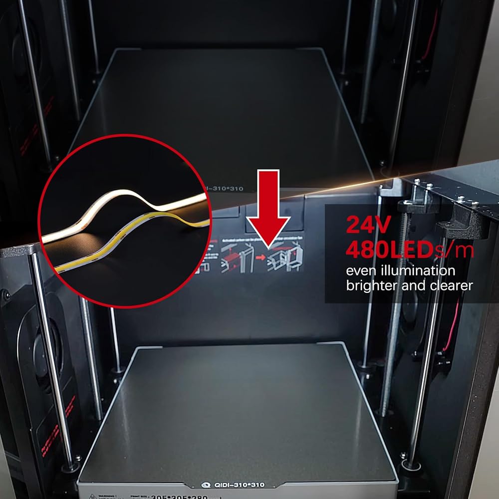 إضاءة ممتازة: تتميز مجموعة شريط الإضاءة LED بـ 480 مصباح LED/م، مما يوفر سطوعًا عاليًا وتجسيد ألوان ممتاز. يؤدي ذلك إلى إضاءة الجزء الداخلي للطابعة بوضوح معزز، مما يسهل مراقبة الطباعة والرؤية التفصيلية. توفر الطابعة ثلاثية الأبعاد أيضًا إضاءة محيطية للطابعات ثلاثية الأبعاد، مما يوفر توزيعًا متساويًا للضوء وأداء طويل الأمد. على الرغم من سطوعه، إلا أنه يقلل من إجهاد العين بشكل فعال