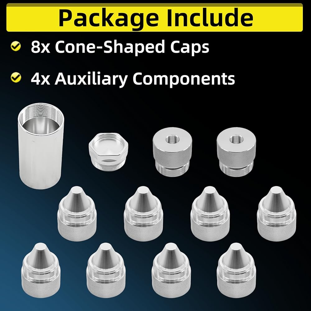 تتضمن الحزمة: 8x قبعات على شكل مخروطي و4x مكونات مساعدة، مجموعة كاملة مصممة لمعظم أقفال عجلات المركبات. التثبيت سريع وسهل - ببساطة قم بلفه يدويًا، لا يتطلب أدوات أو مهارات احترافية، مثالي لمستخدمي الأعمال اليدوية