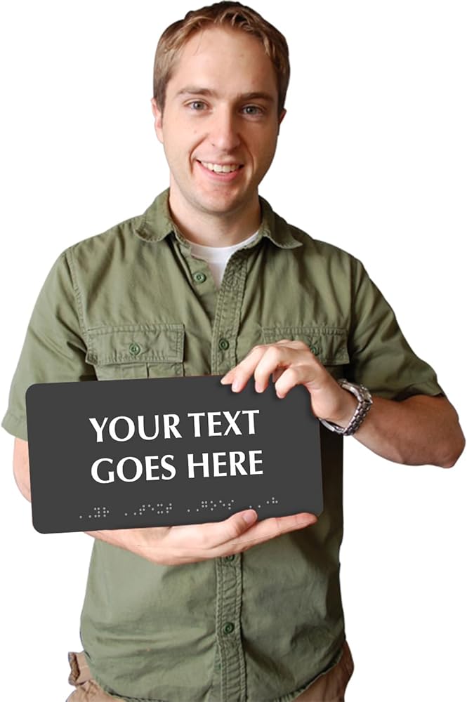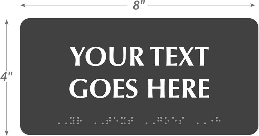 متوافق مع ADA: الالتزام بلوائح ADA 28 CFR الجزء 36. تأكد من إمكانية الوصول إلى رسالتك باستخدام وسيلة إيضاح بارزة أو رسم توضيحي وطريقة برايل من الدرجة الثانية، وكلها على نفس العلامة. سنقوم تلقائيًا بترجمة وسيلة الإيضاح الخاصة بك إلى لغة برايل من الدرجة الثانية. يتم رفع الحروف بنسبة 1/32".