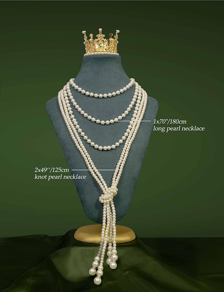 قلادة لؤلؤ مصنوعة يدويًا بنسبة 100% من العشرينيات من القرن الماضي، إكسسوارات العشرينيات للنساء: 2 قلادة من اللؤلؤ بعقدة طويلة 49 بوصة وقلادة واحدة بطول 70 بوصة يمكن لفها حول رقبتك لجعلها تبدو أكثر امتلاءً كما هو موضح في الصورة