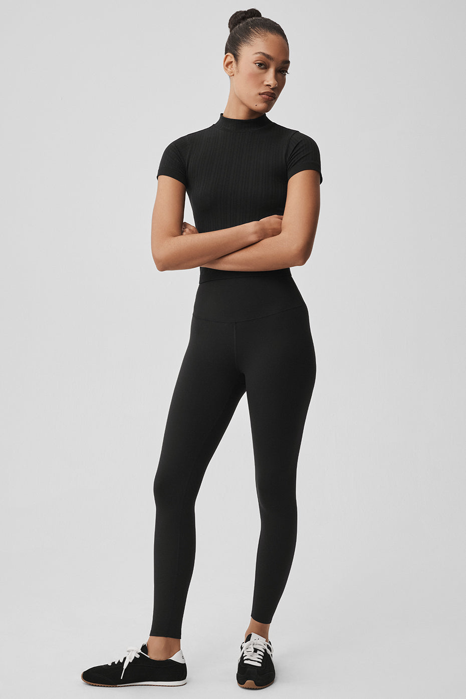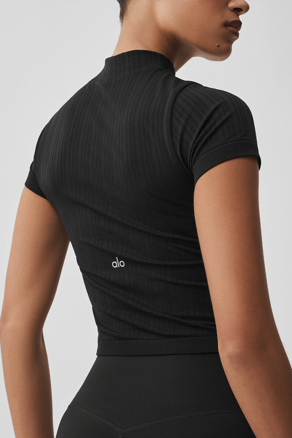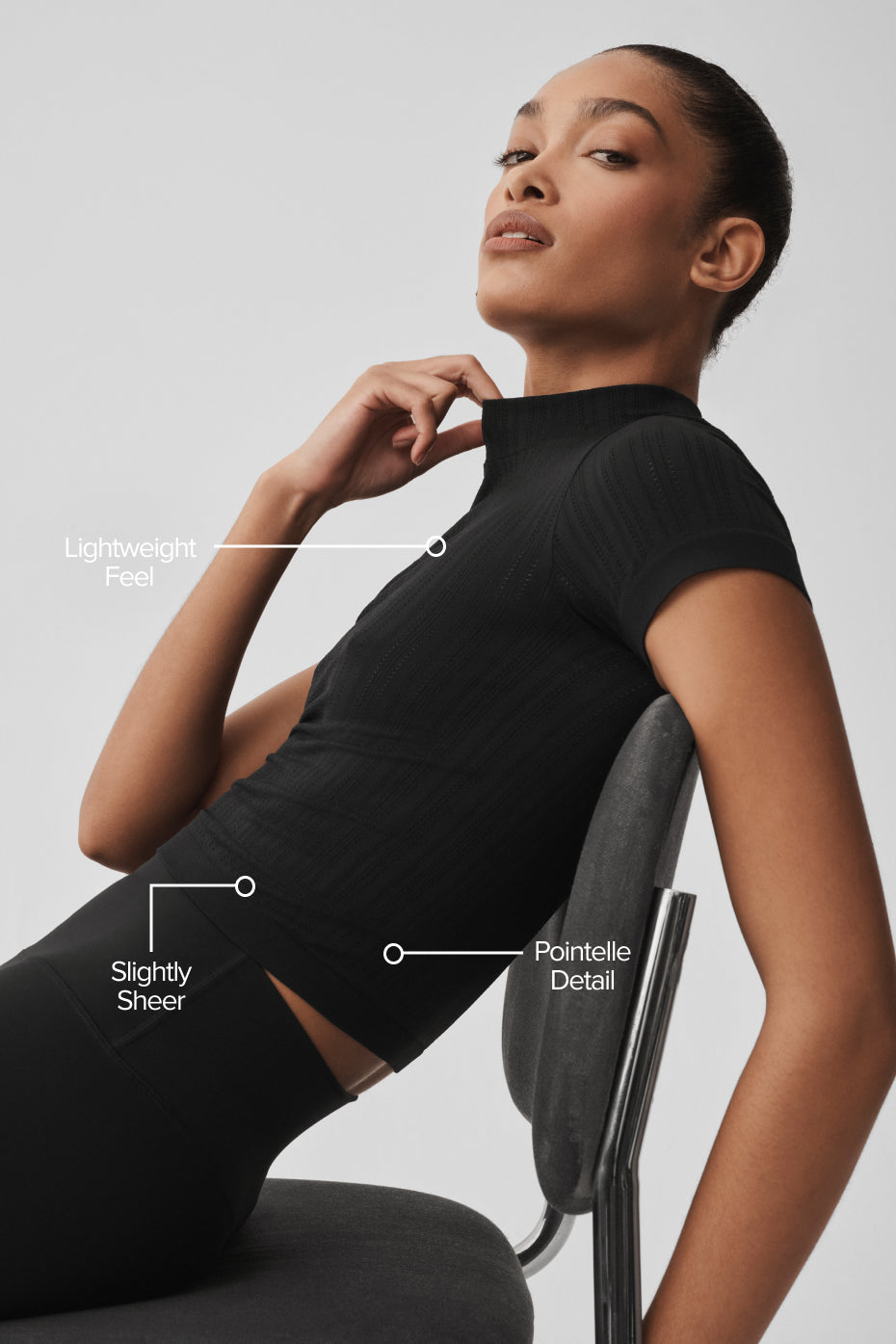 The Seamless Pointelle Mock Neck Short Sleeve is a modern essential with a subtle nod to vintage dressing. This style is softly structured, delicately textured, and designed to skim the body just right. The refined neckline adds polish, while the breathable pointelle knit keeps it effortless and wearable from morning resets to evening plans. Wear it solo for a clean, sculpted look or layer it under tailoring when the vibe calls for something sharper.