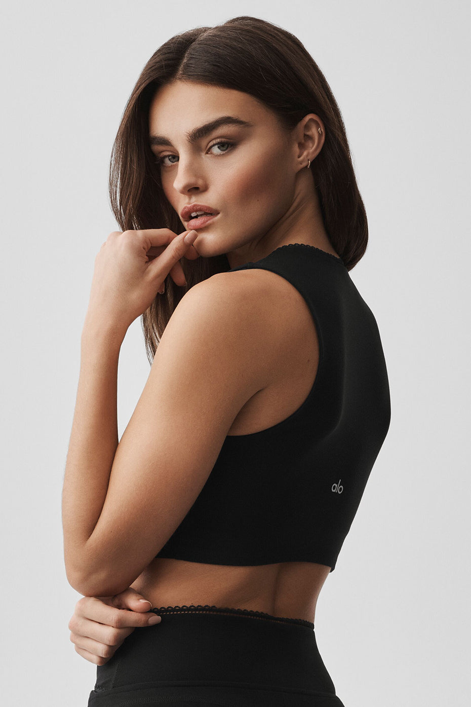 Something sweet is in the air. The Alosoft Affection Tank is made from our signature Alosoft fabric with light compression and a seamless design for a comfortable fit. It has a built-in shelf bra with removable cups, so you can have the perfect fit. Subtle lace trim, a cropped silhouette, and a chic V-neckline complete the look. Pair it with another piece from the Affection capsule for a charming look with a vintage feel.